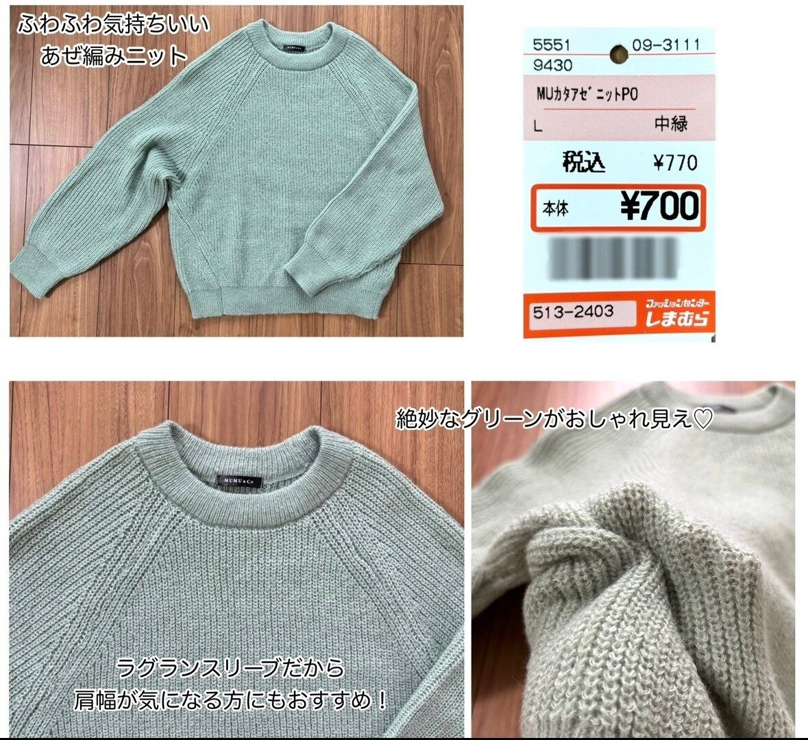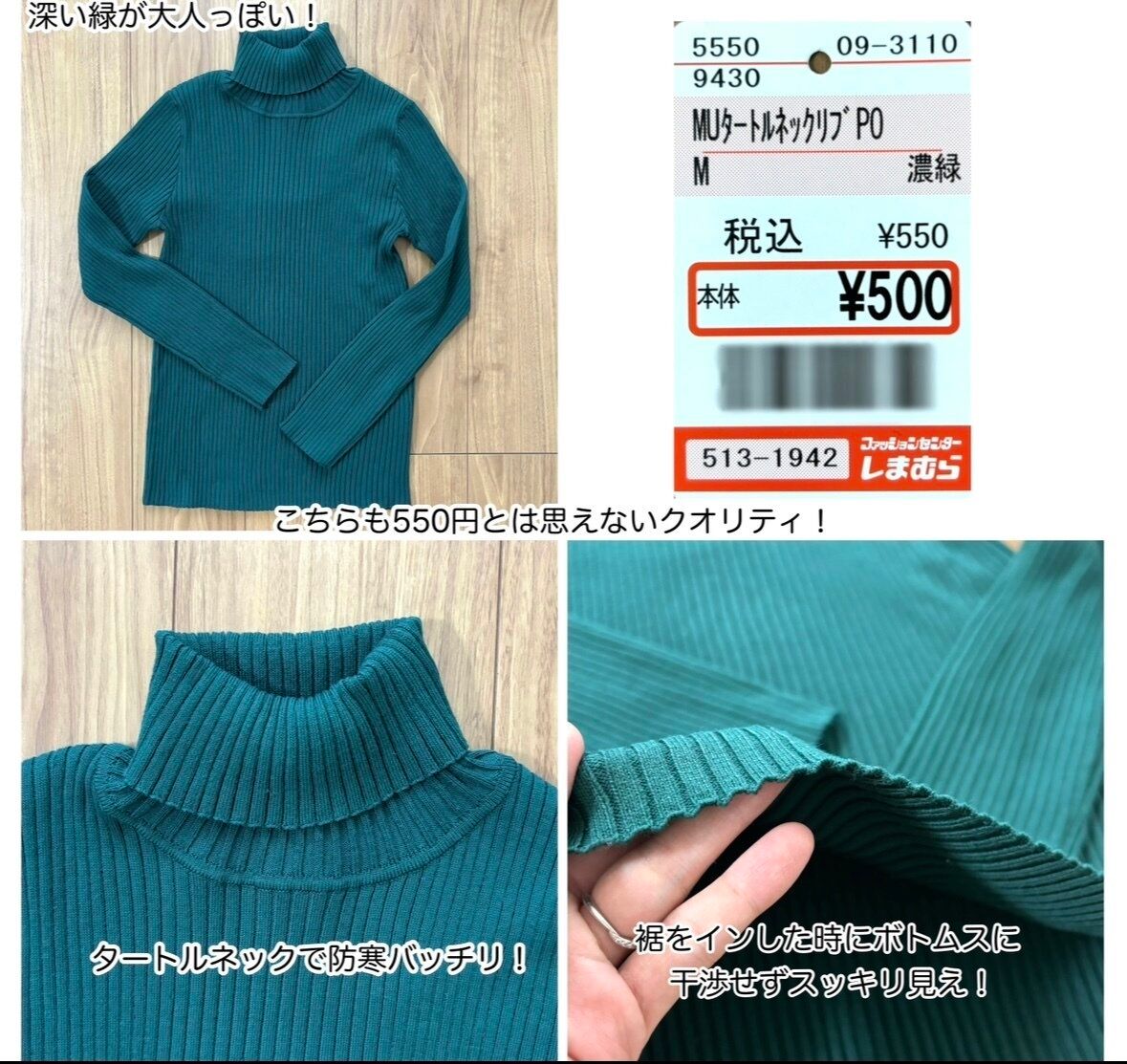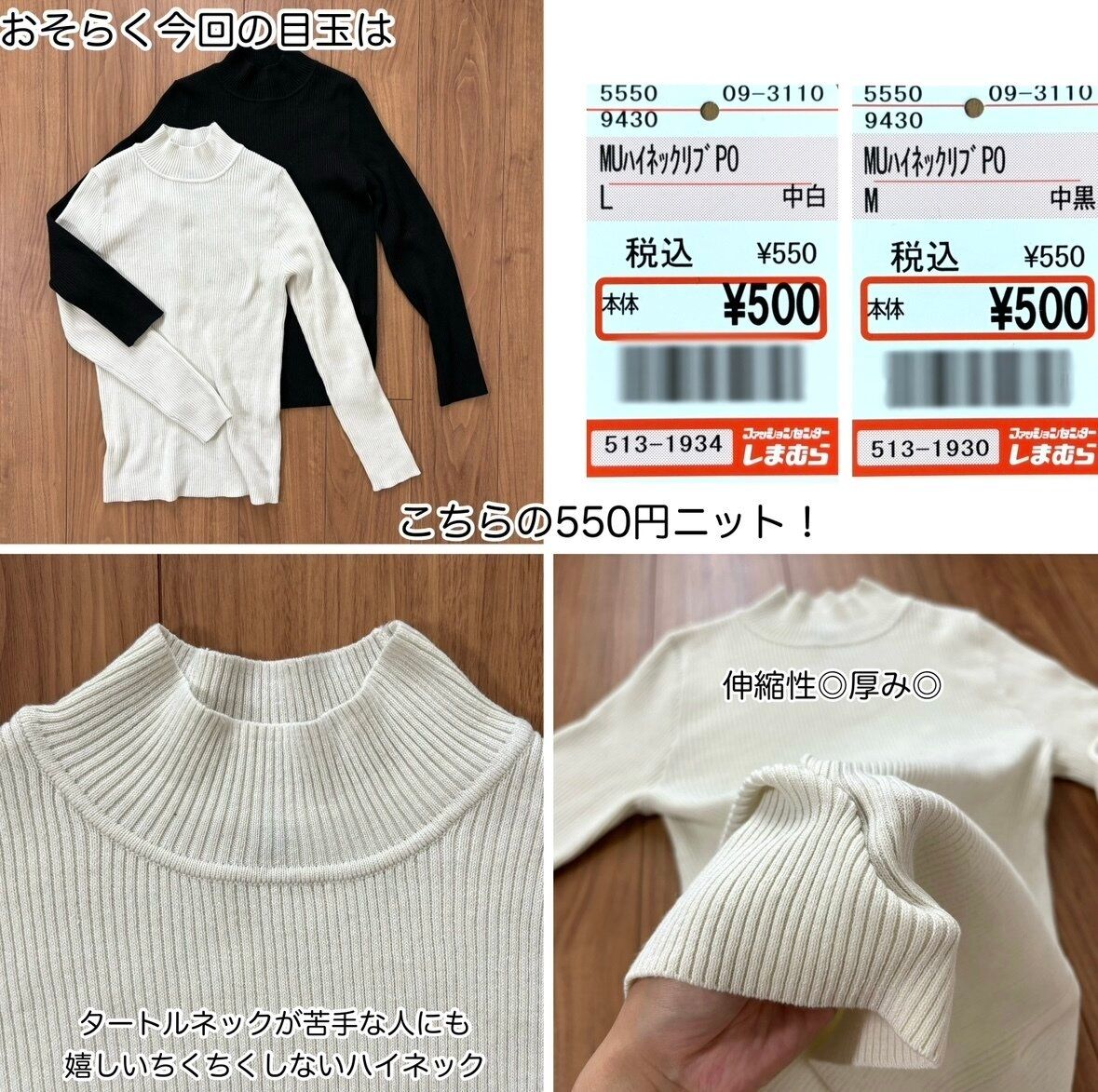 こちらのニットも550円という信じられないプライス。プチプラとは思えないしっかりと厚みのあるニットで、伸縮性も抜群の流行り廃りのないベーシックアイテムです。