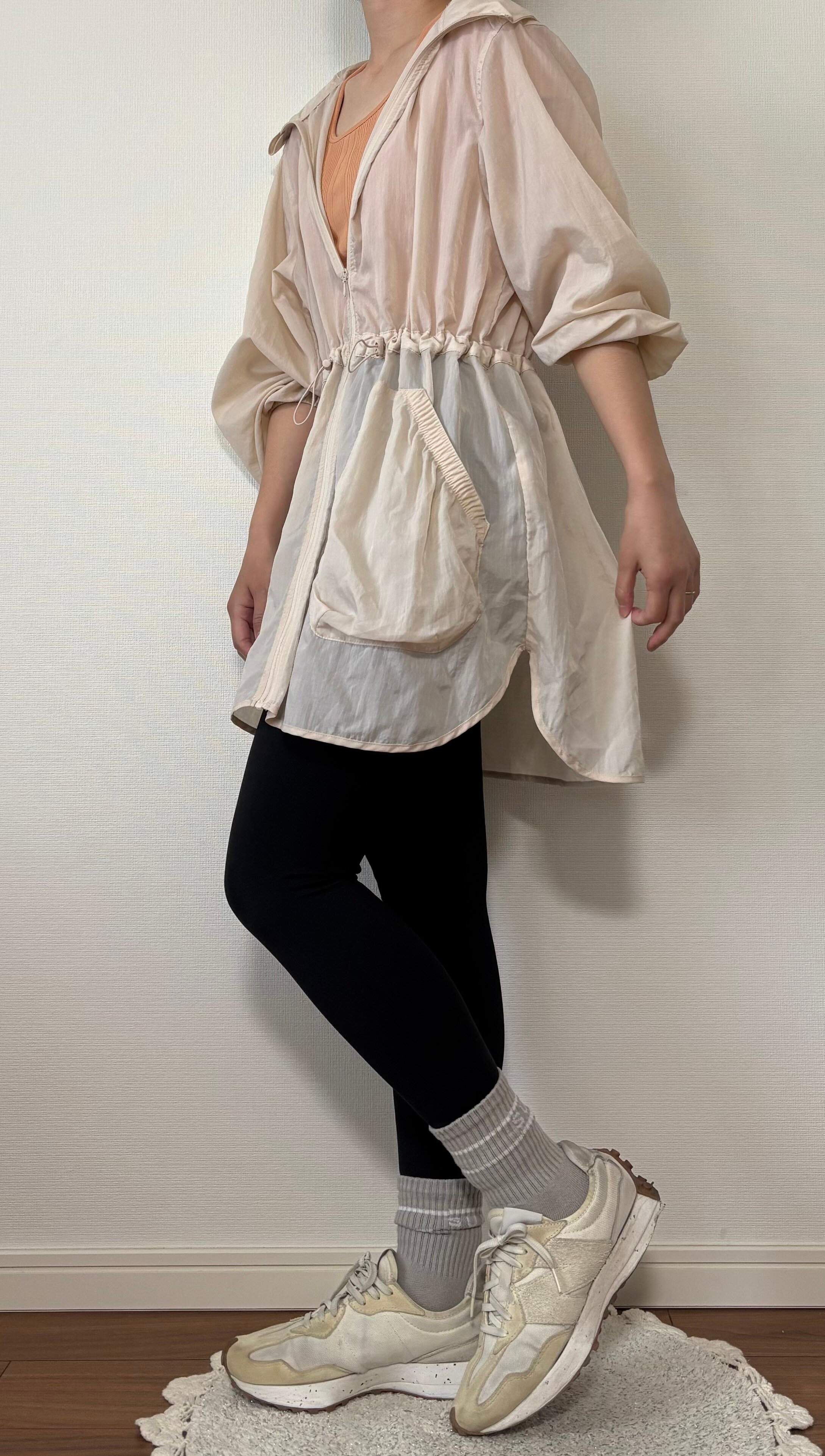 身体のラインが出るウェアの上に羽織ればお尻までカバーしてくれるので安心。暑い日も薄くて軽いシアー素材なので羽織りやすいです。