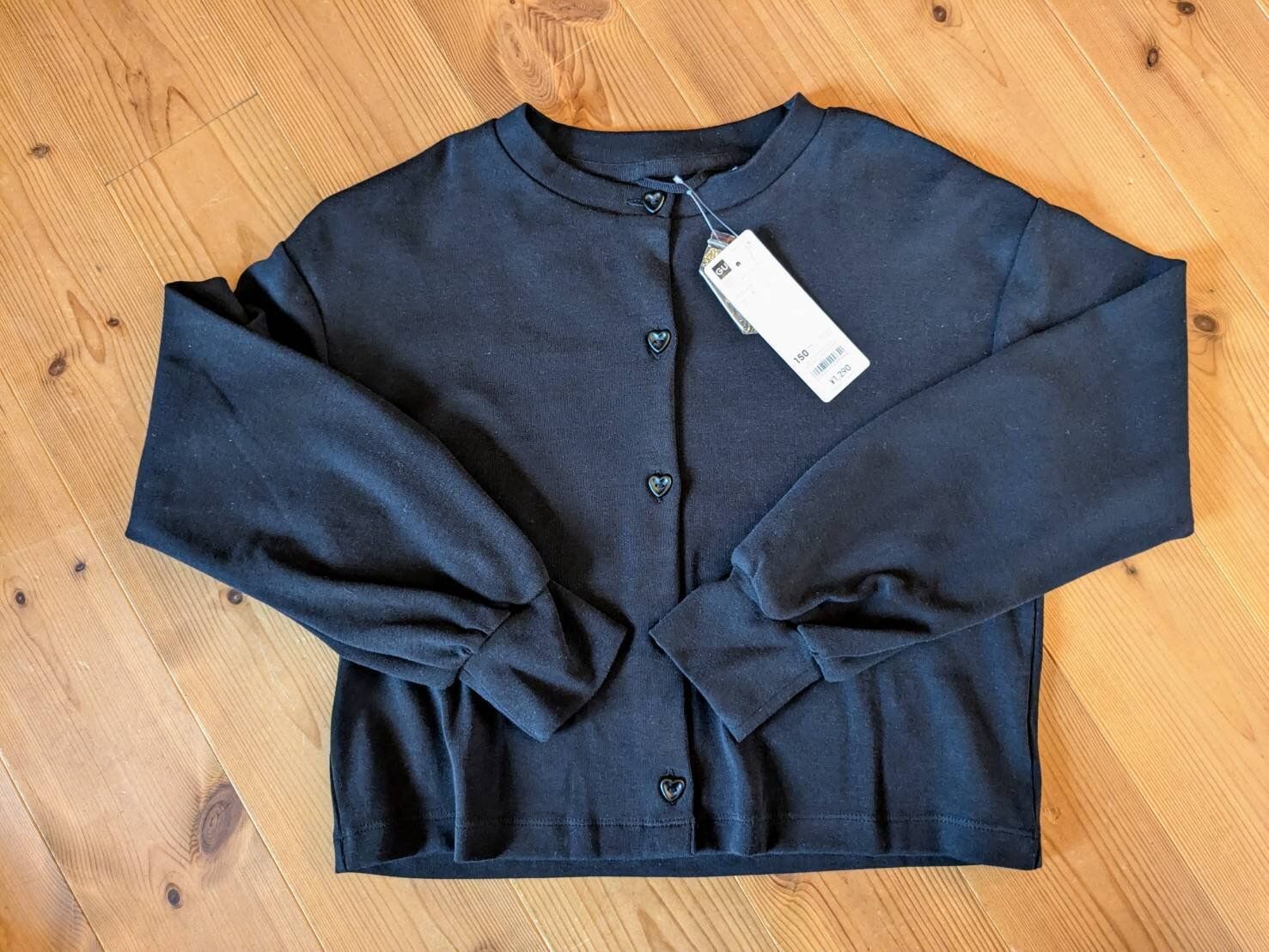 159cmの筆者で150サイズを着用していますが、着丈はもちろん、袖丈も問題なし!また、ボタンはさりげなく同色のハート型になっていますが、目立ちすぎることもないため、大人でも問題なく着こなせますよ。