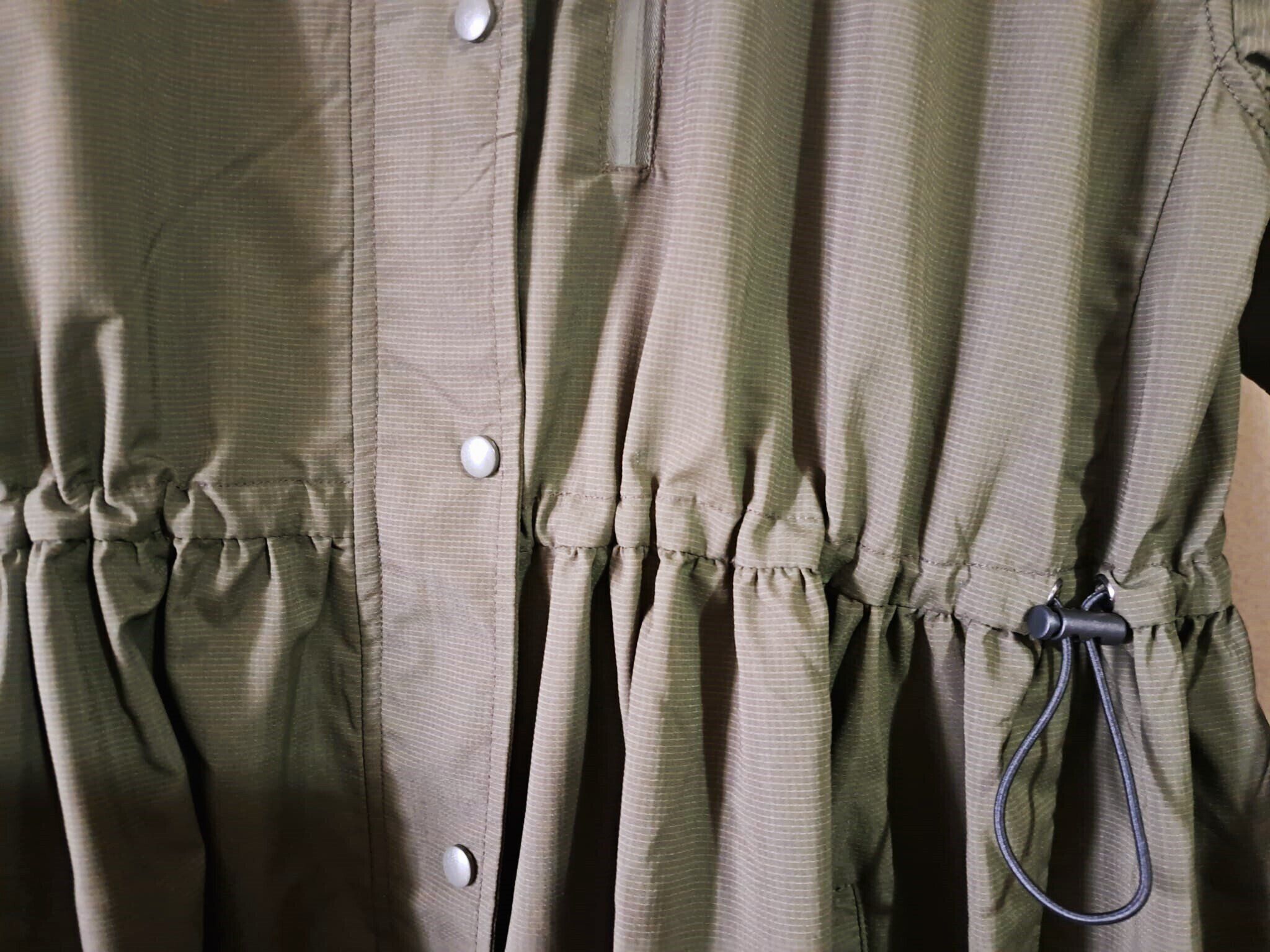 ウエストにあるスピンドル(ドローコード)で好みのウエストにできるので、ウエストをきつめに締めるとAラインのワンピースのようにも着こなせるので、いろいろ違った雰囲気を作り出せる1着なので、コスパいいかと思います。