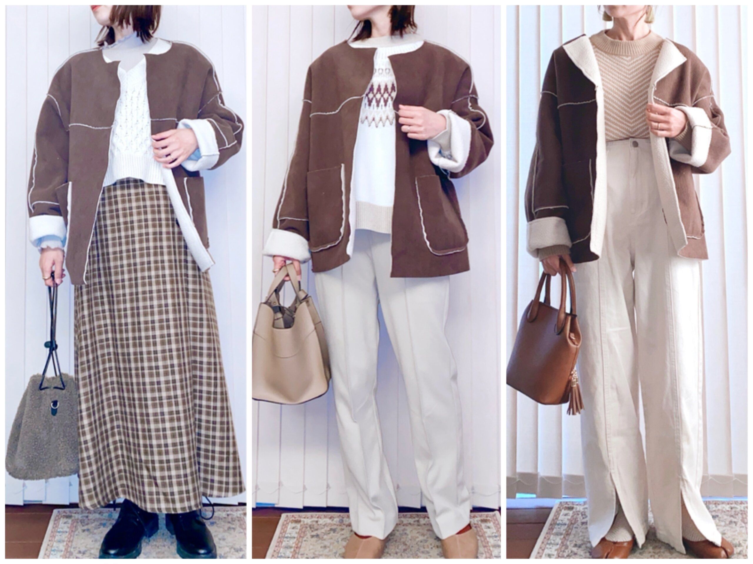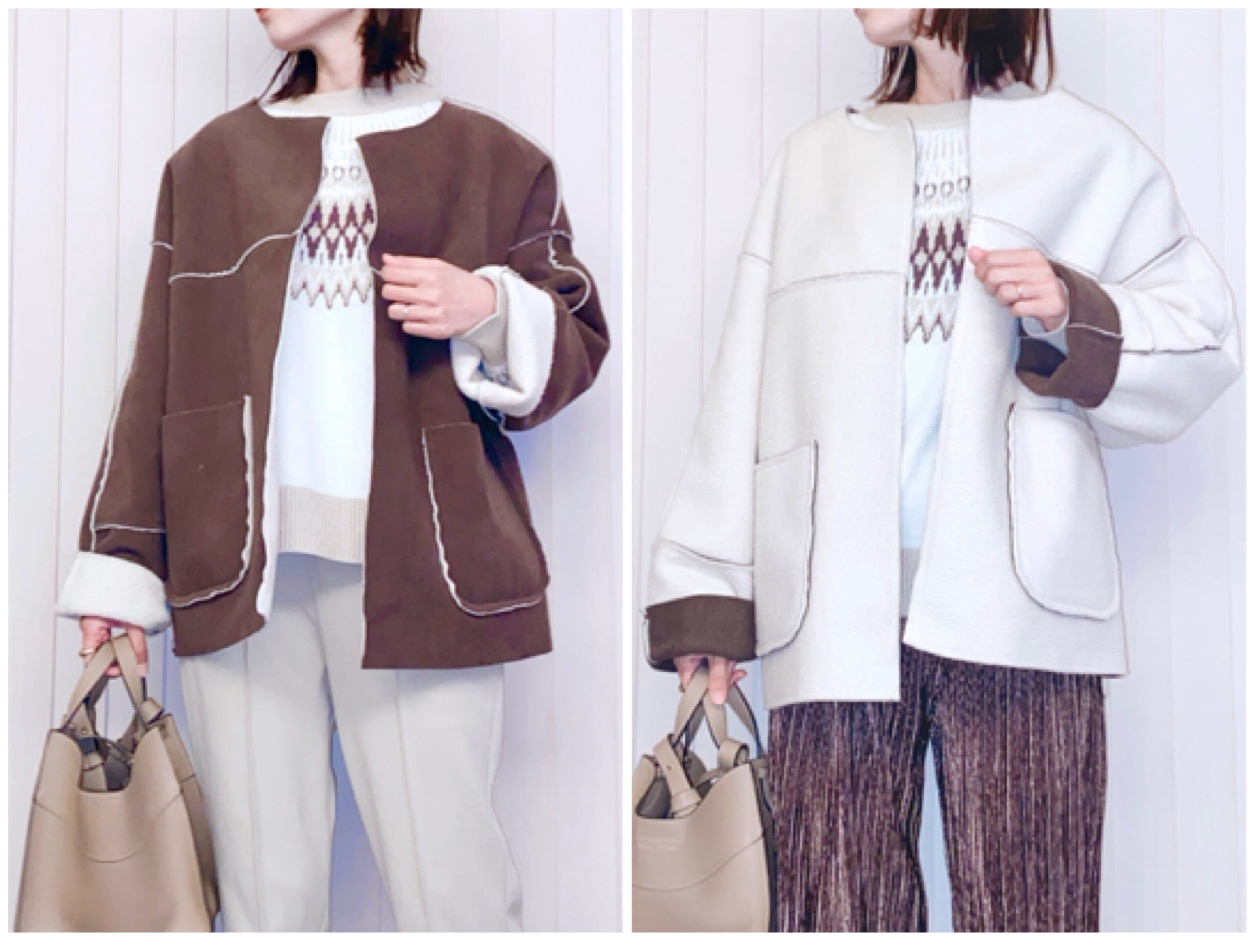 ボア素材の方はアイボリーなので、どんなアイテムとも合わせやすいです。こちらも求心柄やワッフルボーダー柄ニットとも合わせやすく、濃い目のカラーニットと合わせるのも可愛いです。