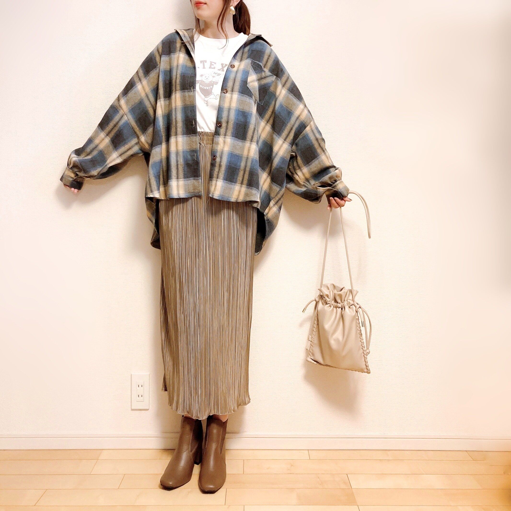 チェックシャツはカジュアル合わせが定番でかわいいですが、こちらのプリーツスカートのような少し女性らしいアイテムと合わせるのも大人っぽい雰囲気になってオススメです。