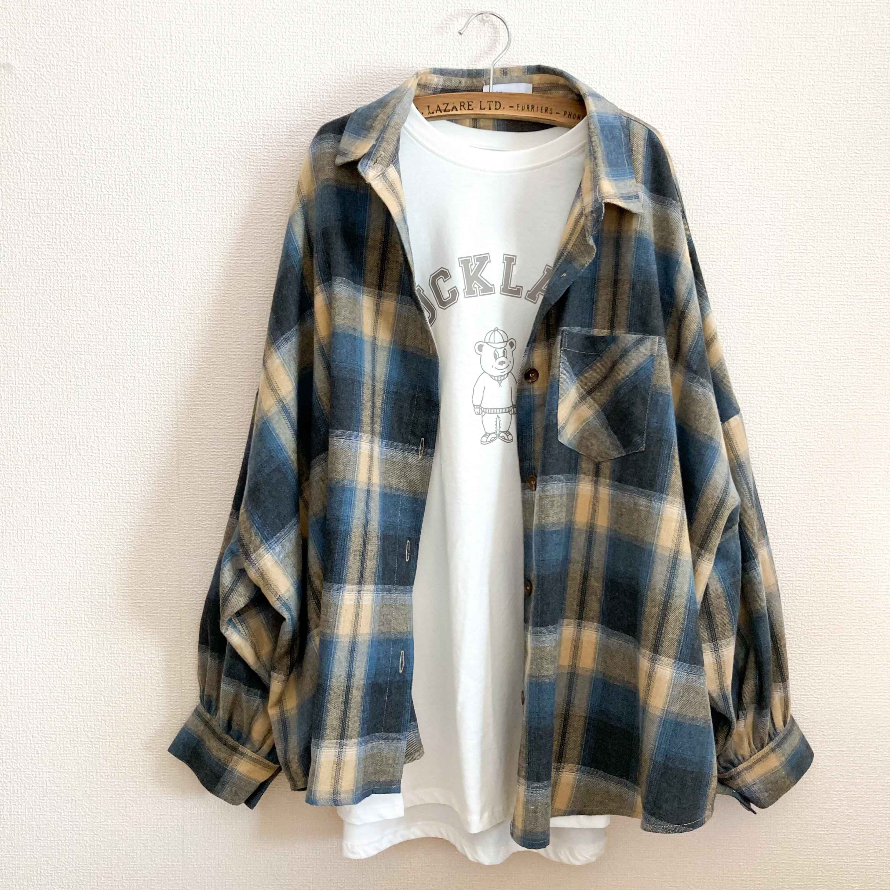 くすんだブルーにイエローベージュの大きめチェックが大人かわいいシャツ。ほんのり起毛した生地は柔らかくて温かみがあります。