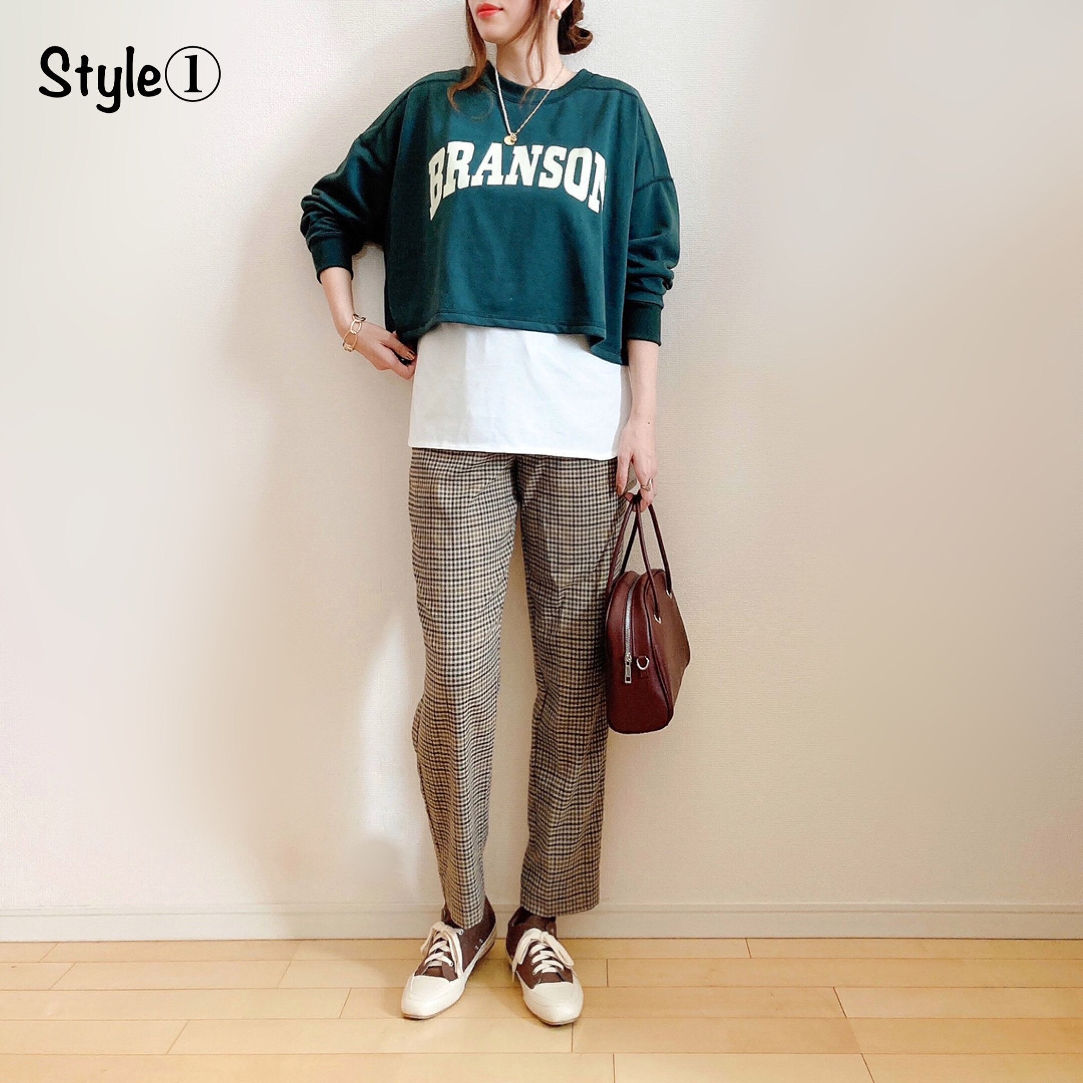ブラウンチェック柄のシェフパンツに長め丈の白シャツをレイヤード。スニーカーとバッグもブラウン系で統一しました。秋のお出かけにもぴったりな定番カジュアルコーデです。オールしまむらコーデ。