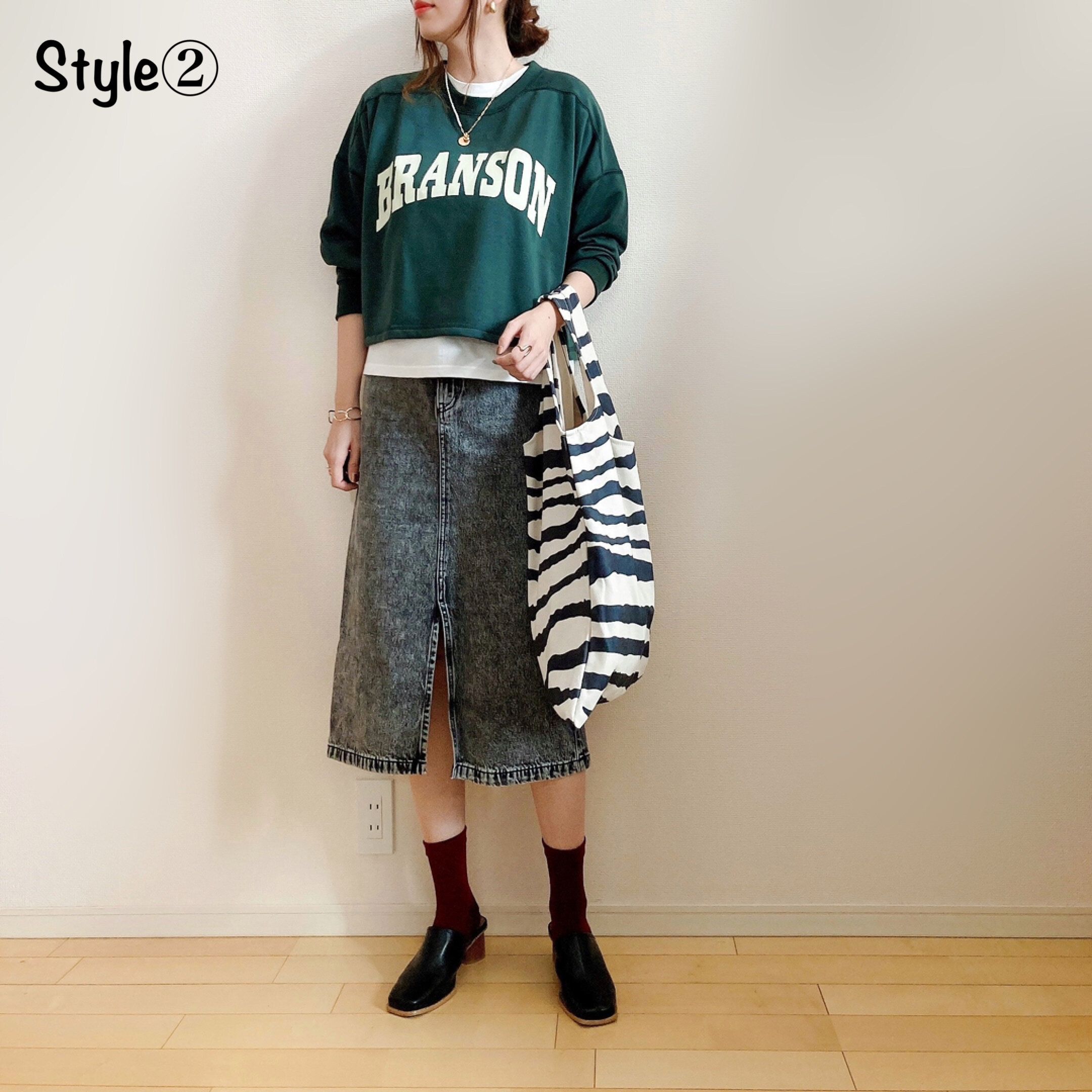 GUのケミカルウォッシュグレーデニムのタイトスカートと合わせて。レイヤードは短めの白Tシャツでバランスを取っています。サボミュールにボルドーの靴下を合わせて肌見せの分量を調整しました。cocaのゼブラ柄バッグをコーデの辛口アクセントに。