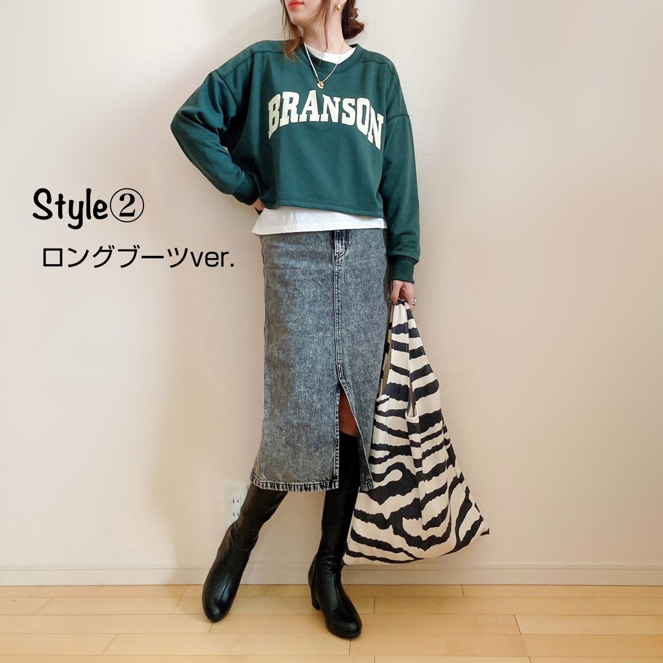先程のコーデの足元をロングブーツにチェンジすると、グッと今年らしく。ロングブーツを合わせるスタイルは今季流行しているので、一足は持っていると便利なアイテムです!