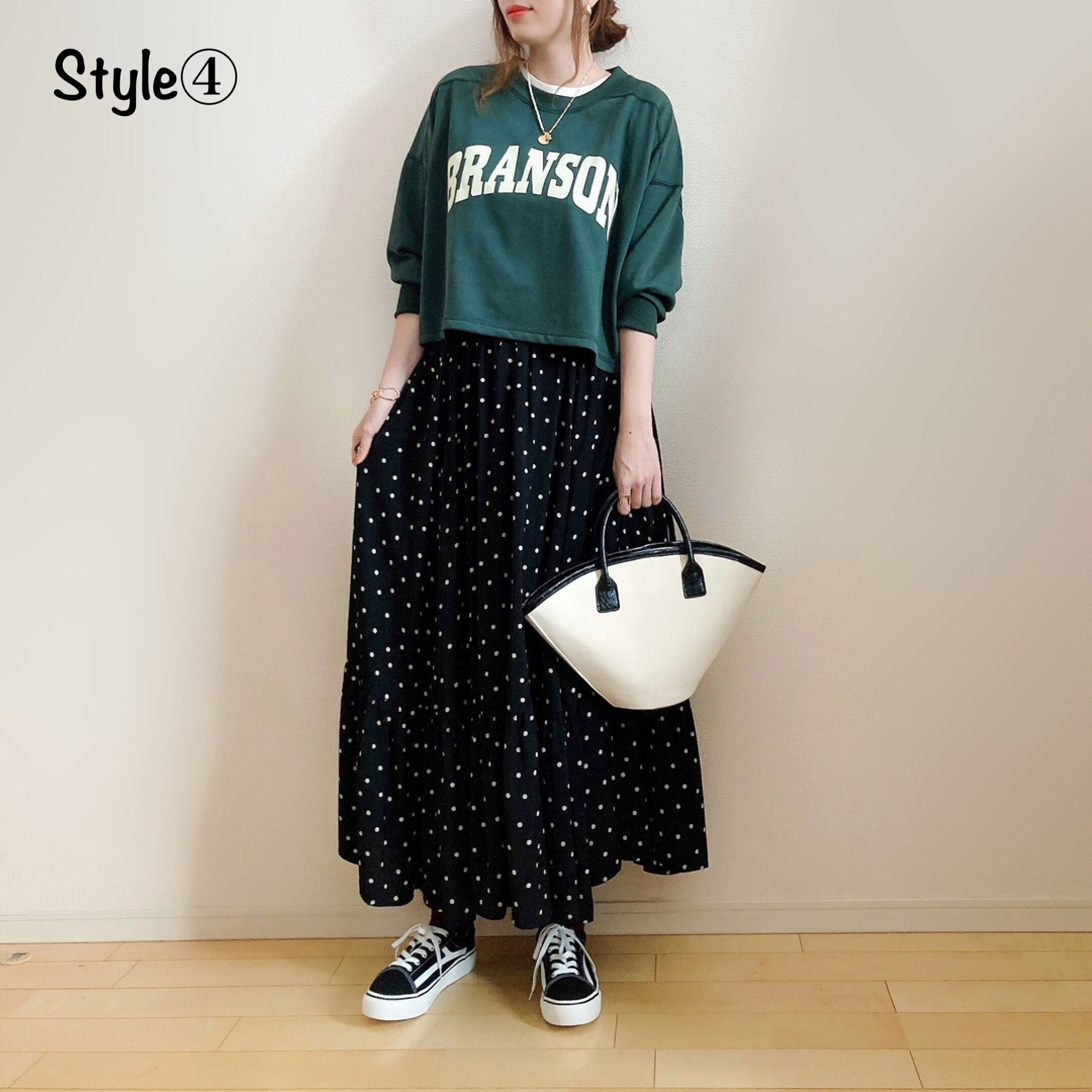ドット柄のティアードスカートと合わせて。甘めのアイテムもカジュアルなスウェットやスニーカーと合わせると大人女子でも取り入れやすいですね。