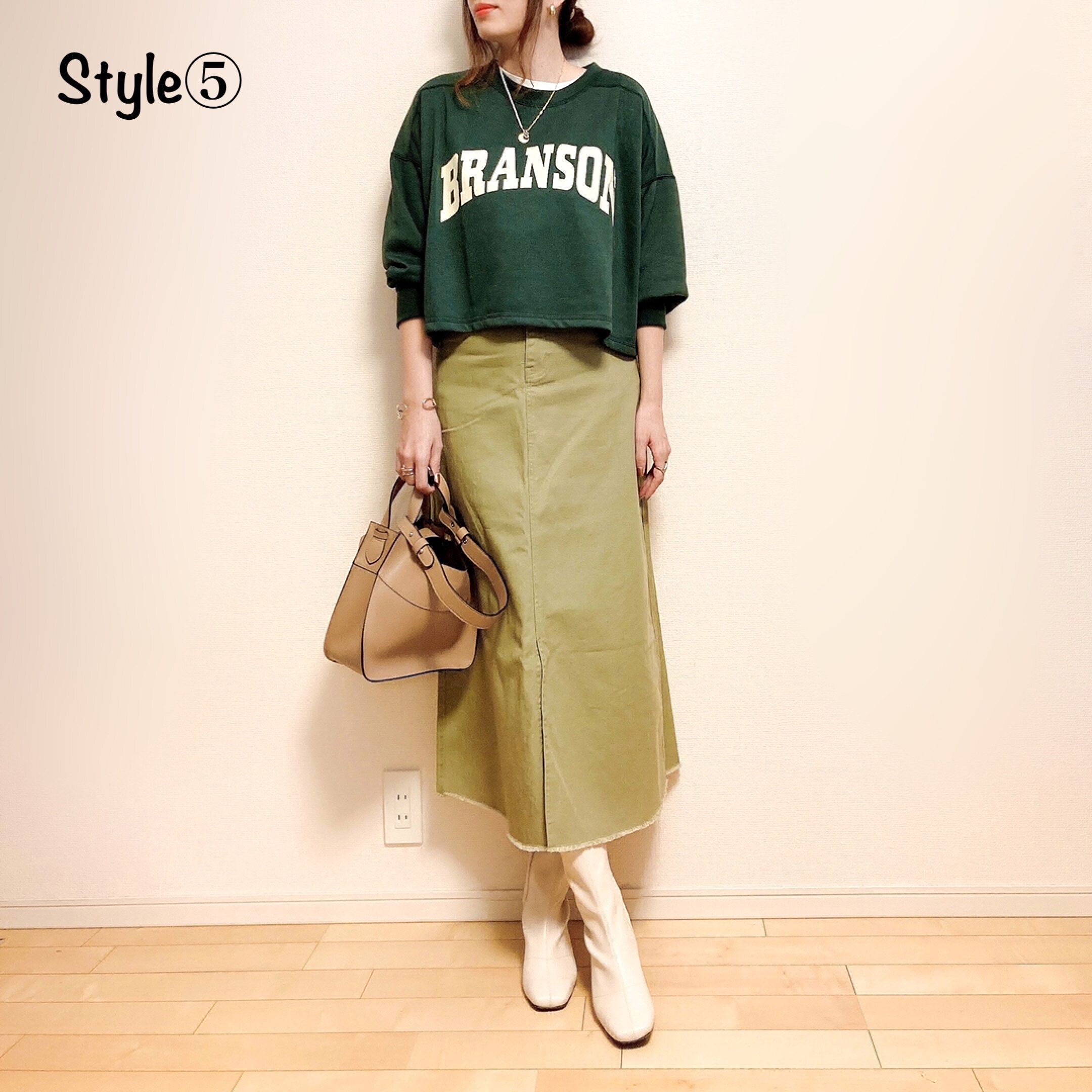 cocaのピスタチオカラーツイルスカートと合わせた同系色コーデ。案外合う色合わせです。