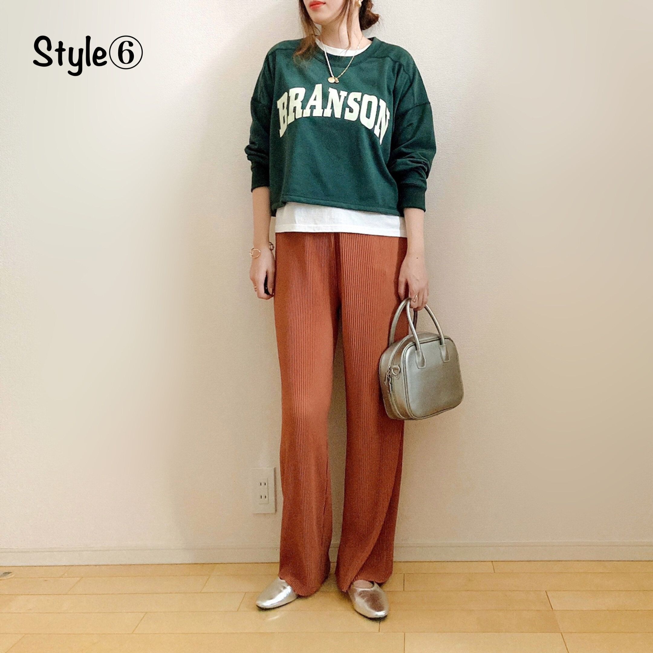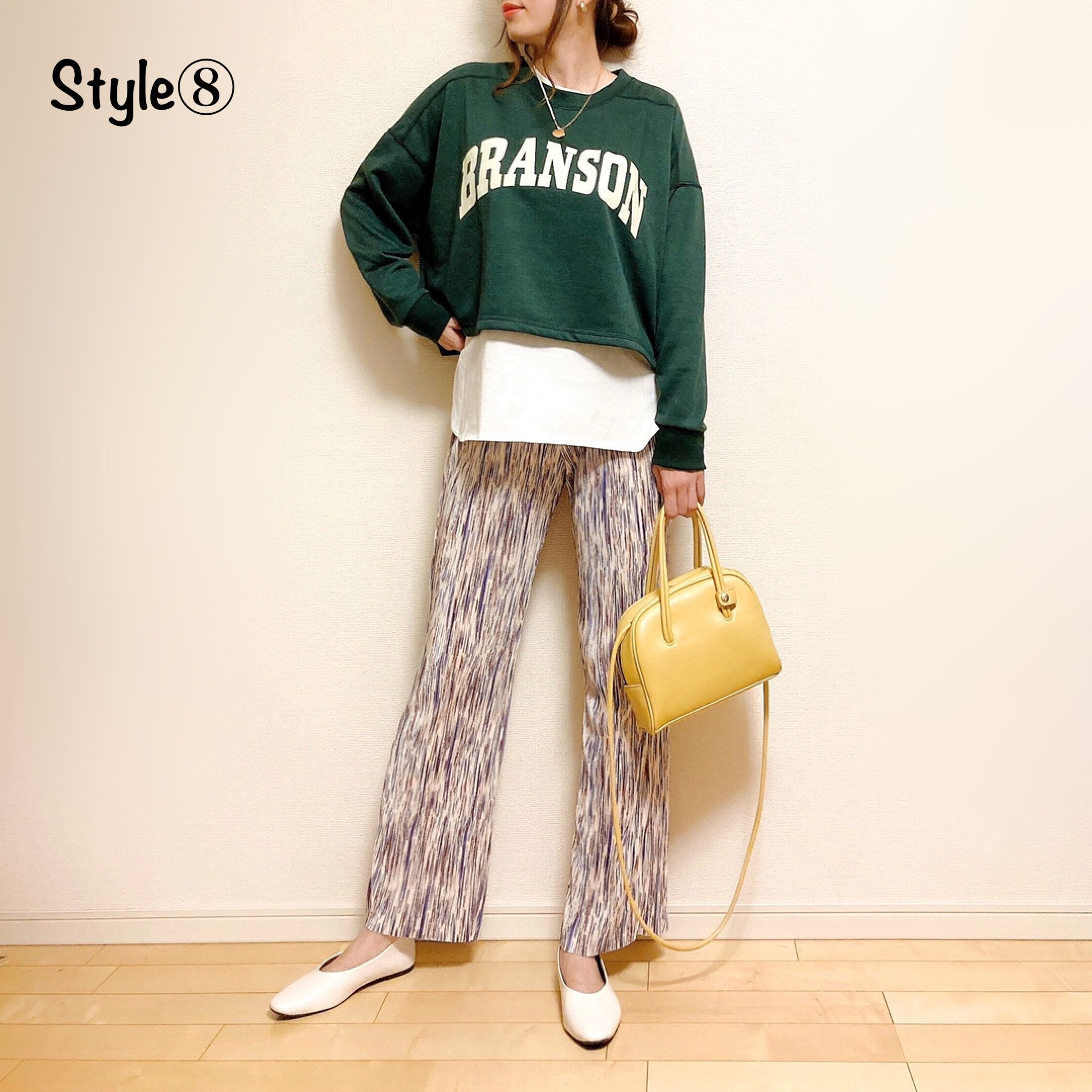 レイヤードはせず、一枚でハイウエストのツイルイージーパンツと合わせて。グリーンとブラウンは相性バッチリ!しまむらの牛柄ファーバッグで秋らしさをプラス。足元はGUのポインテッドトゥのパンプスを合わせて大人カジュアルにしました。