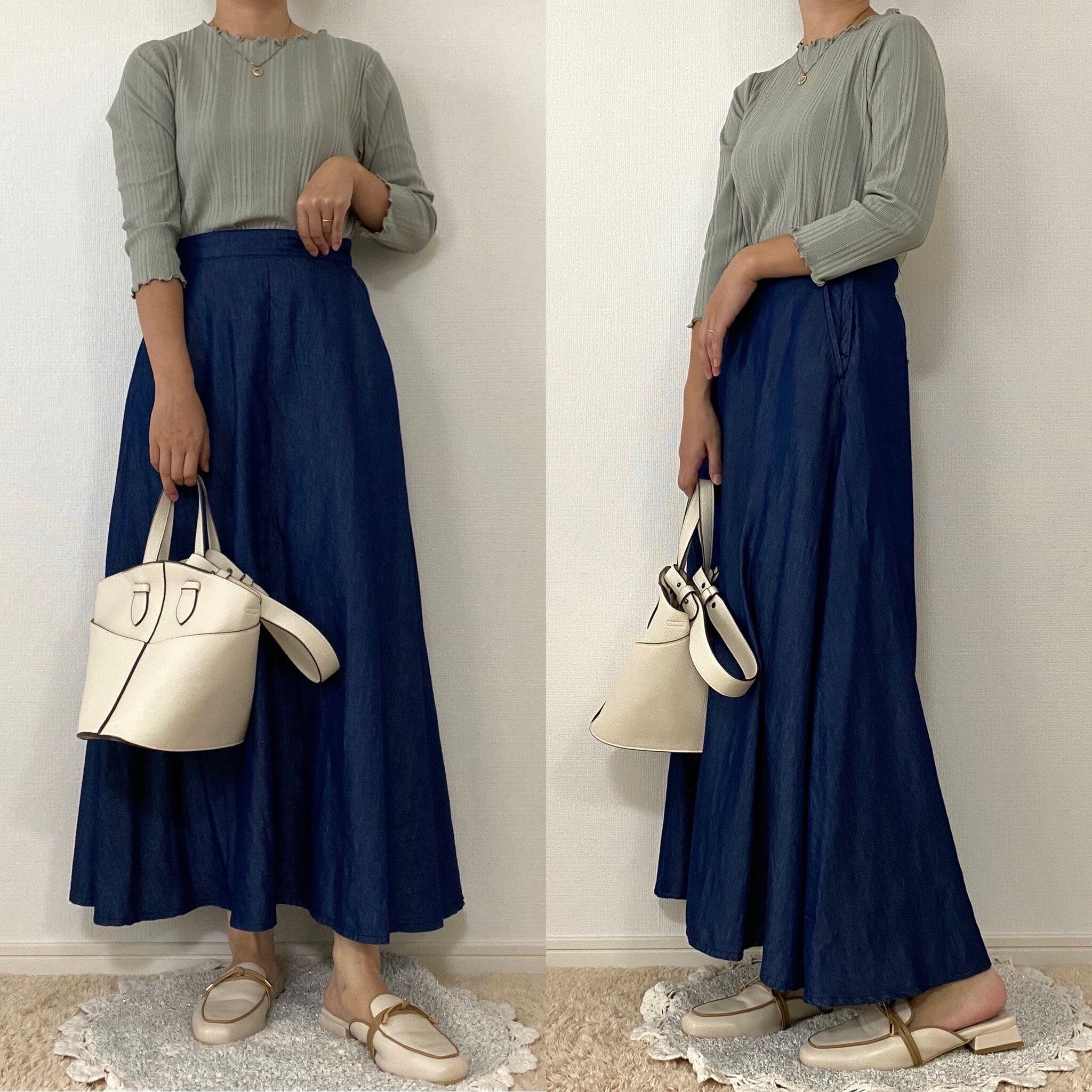 くすみグリーンはネイビーとも良く合いますね。バッグとミュールは白にして女性らしいコーディネートにまとめました。