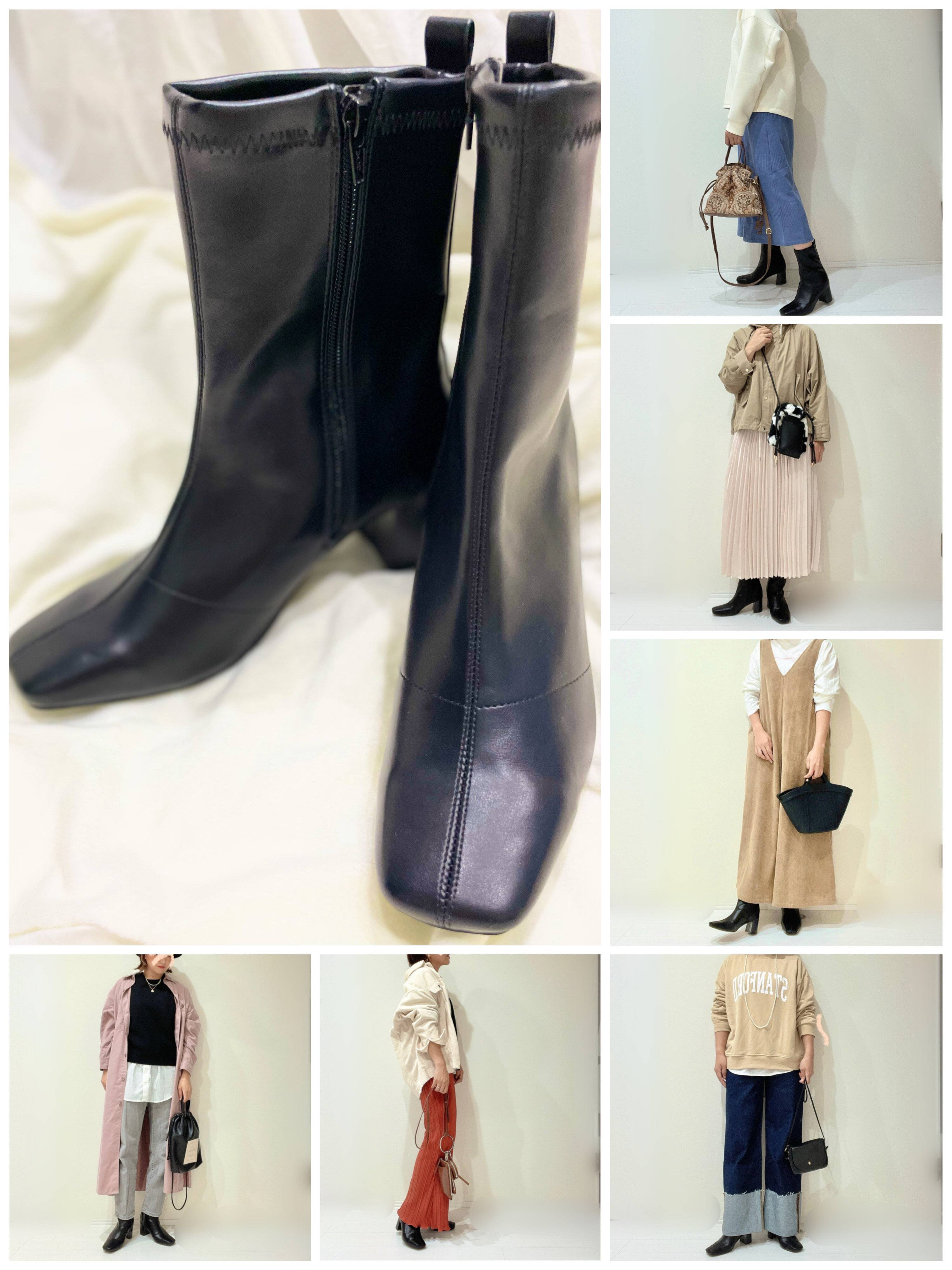 ハーフブーツなので、膝下丈のスカートでもチラッと足を見せる事で、抜け感がでます。またブーツ自体が黒なので、足首が引き締まった印象に。