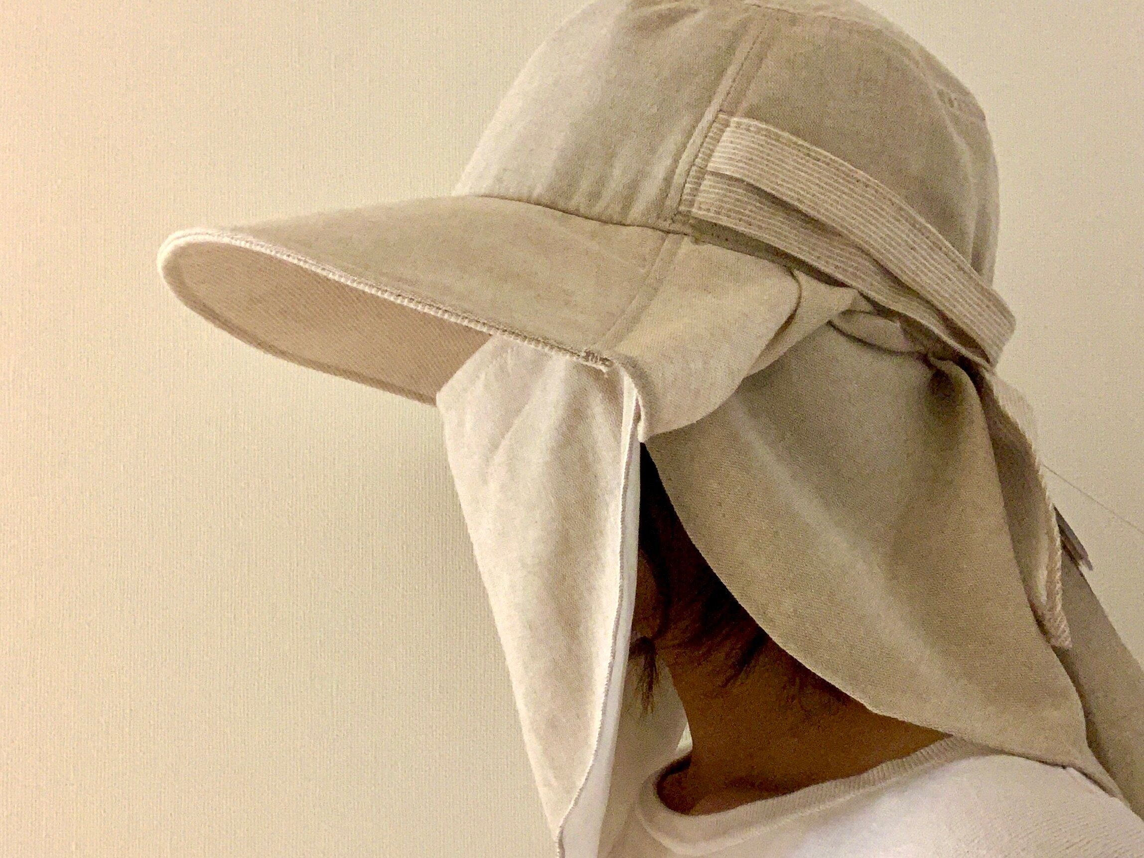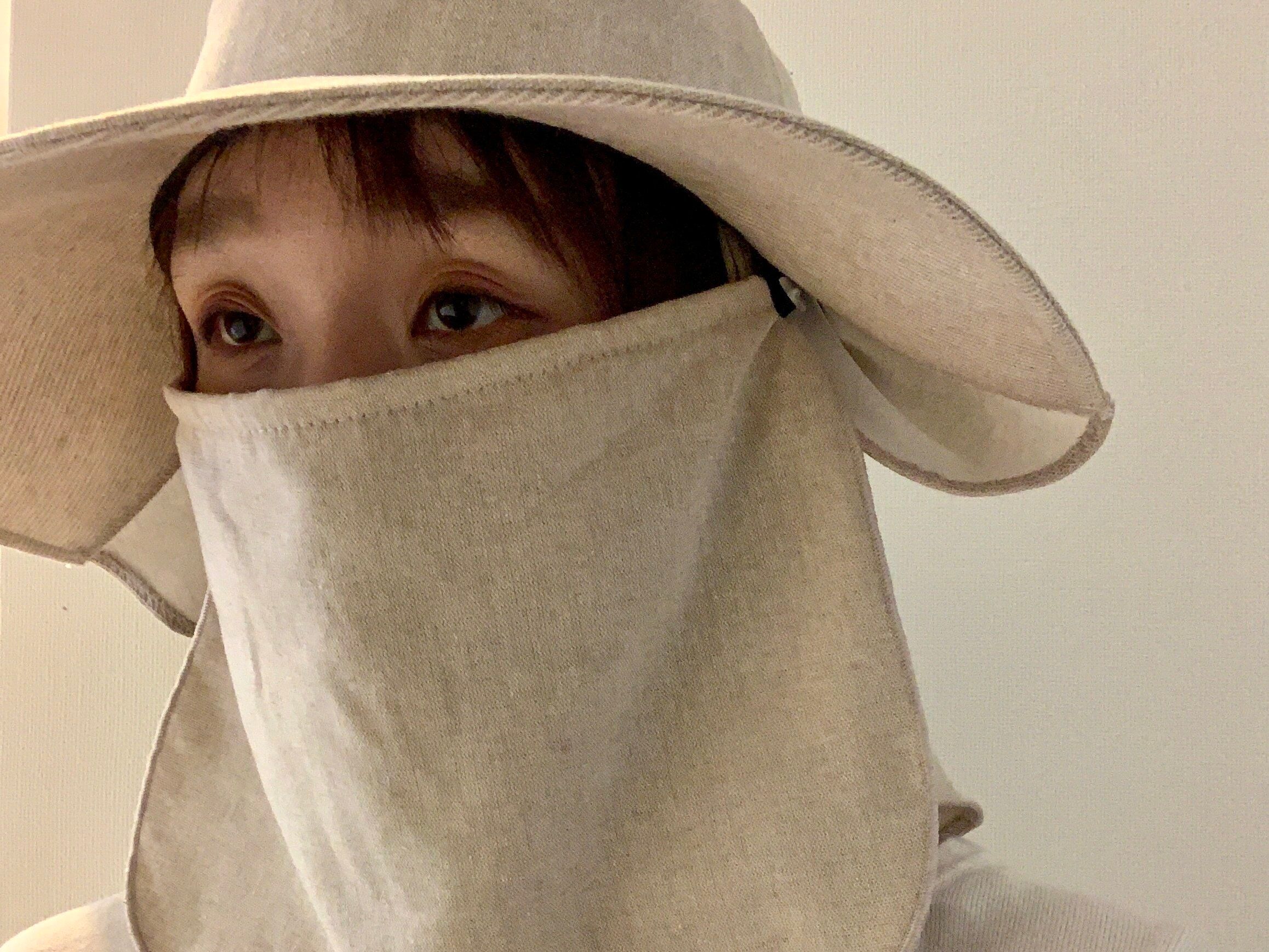 着用をすると、このような感じ。少し見た目は怪しげですが、顔や首の後ろに布があることで直射日光を防ぐことが出来ます。熱中症対策にもなりますね。