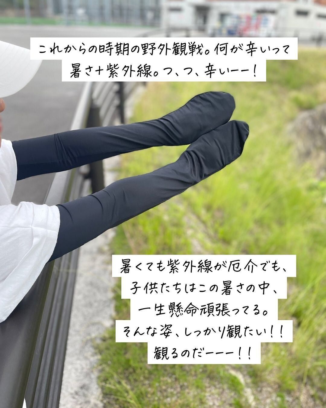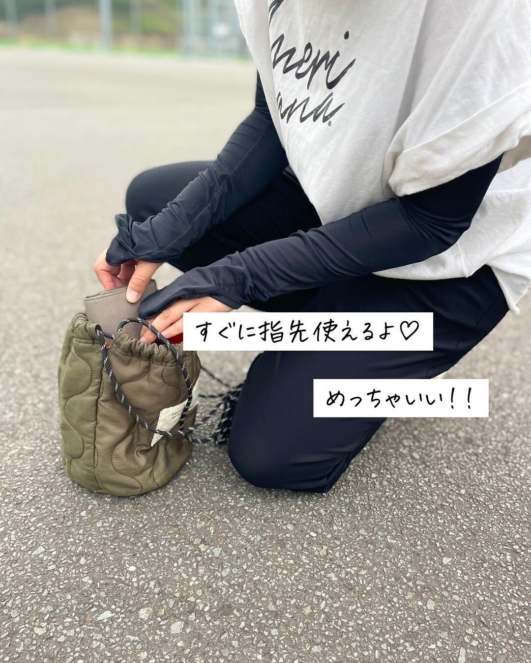 フルカバータイプではあるものの、手のひら側が開いているため、すぐに指先が使えて便利。そのため、携帯の操作やビデオ撮影なども、アームカバーを脱がずにできるのがうれしいですね。インスタグラマーは子どものスポーツ観戦の際に活用しているのだそう。