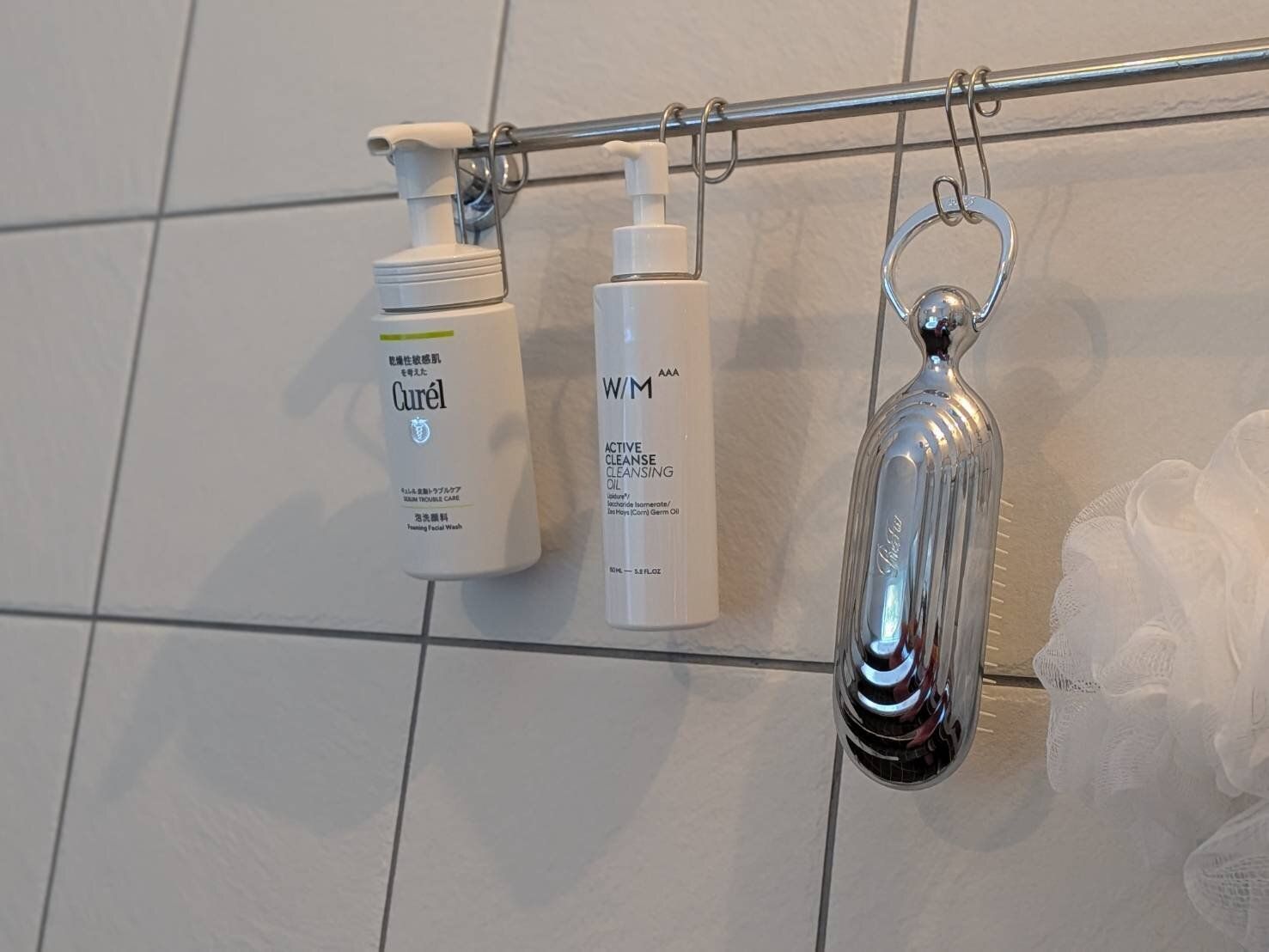 浴室で使うアイテムとあって、フックでかける収納ができるデザインになっています。また、フックはスタンドにもなる2WAY仕様なので、お好みの収納方法を選ぶことができます。
