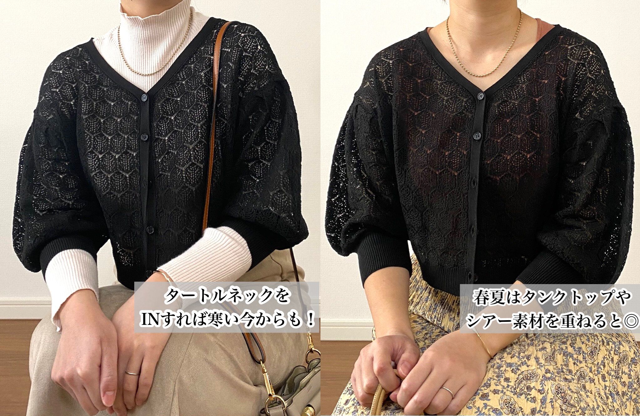 ブラックですが透かし編みのおかげでレイヤードしても重たい印象になりません。