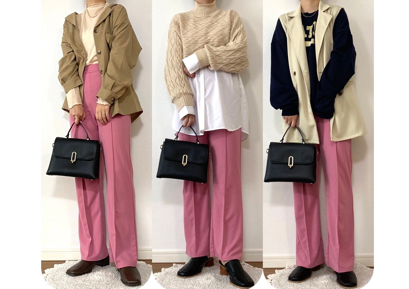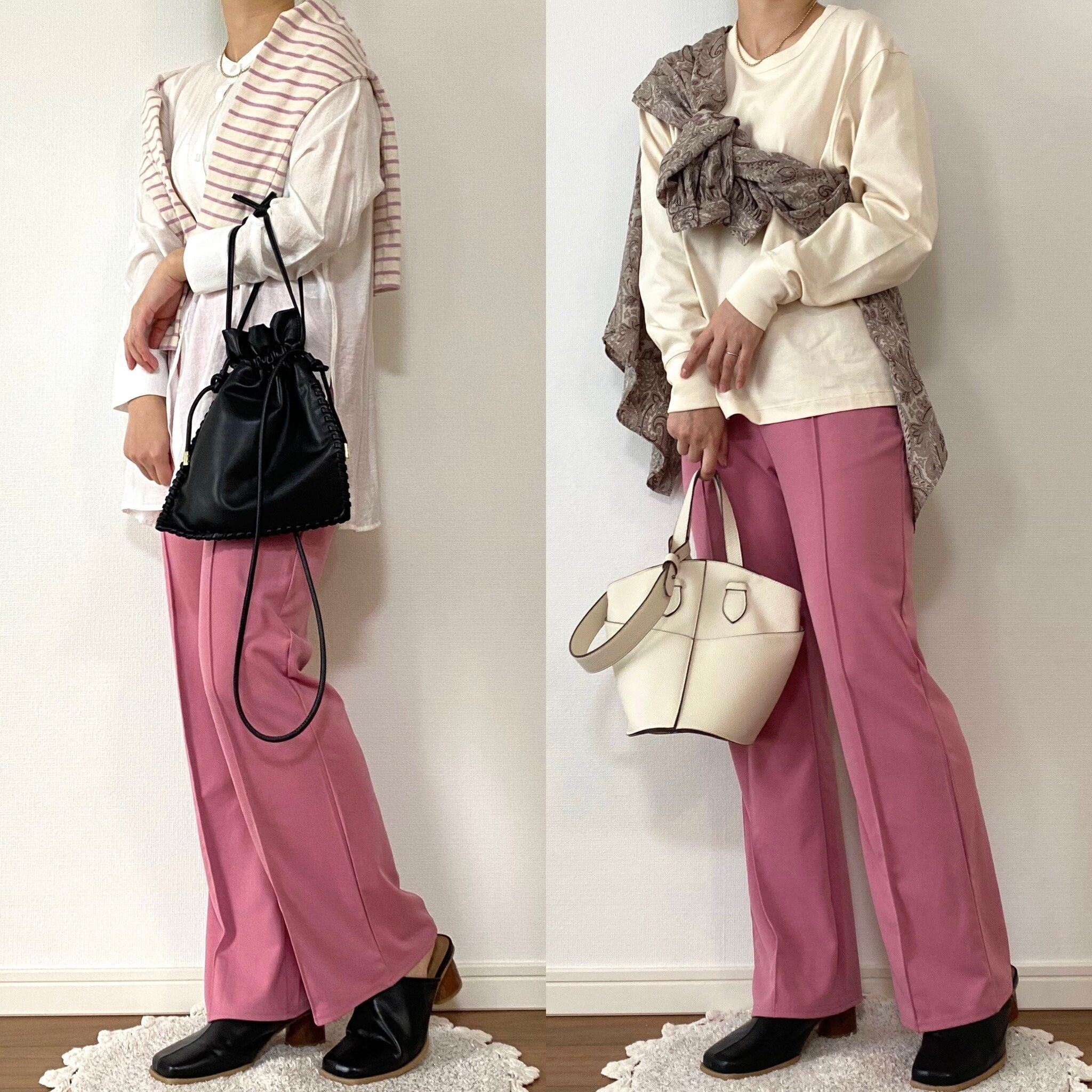 ホワイトとピンクの単調なコーデよりもこなれ感が出て垢抜けます!