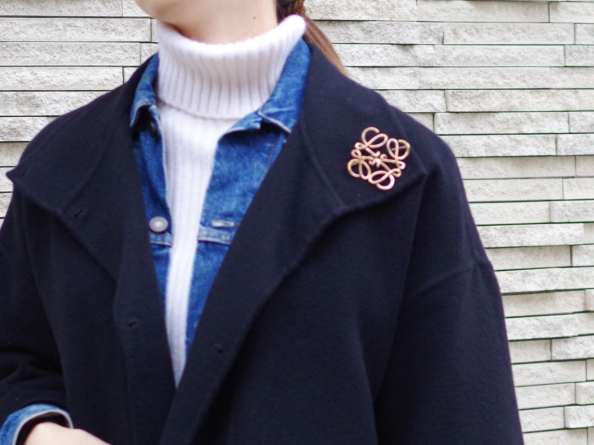 一緒にブローチを付けると、上半身が華やかに。手持ちのコートも、組み合わせ次第で飽きずに長く着こなすことができますよ!