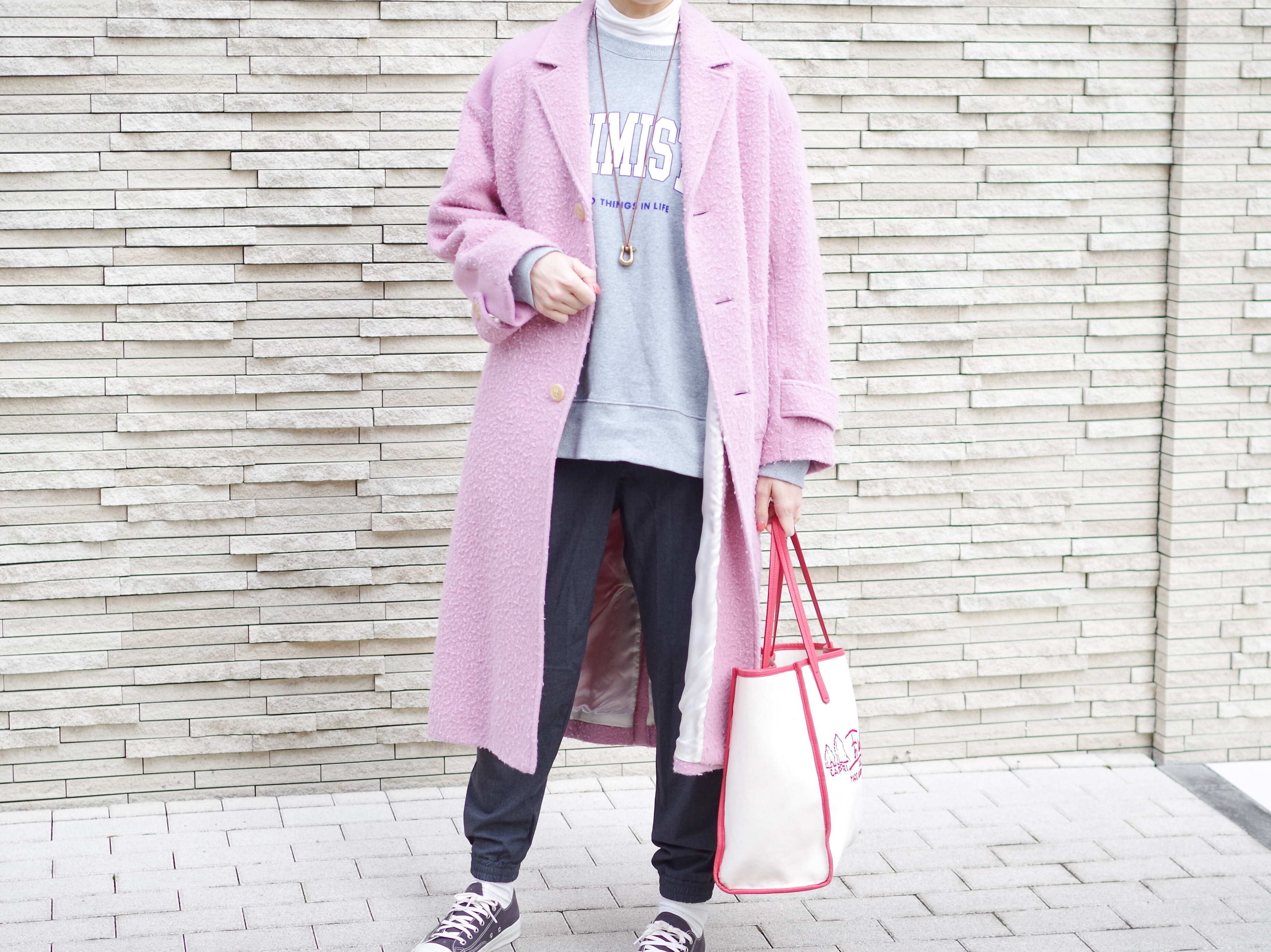 ロゴ文字もポイントになってくれて◎。コートを羽織ってもしっかり存在感を放ちます。カラーコートで華やかにしたスタイルは、冬終盤の今ハマっているコーディネートのひとつです。