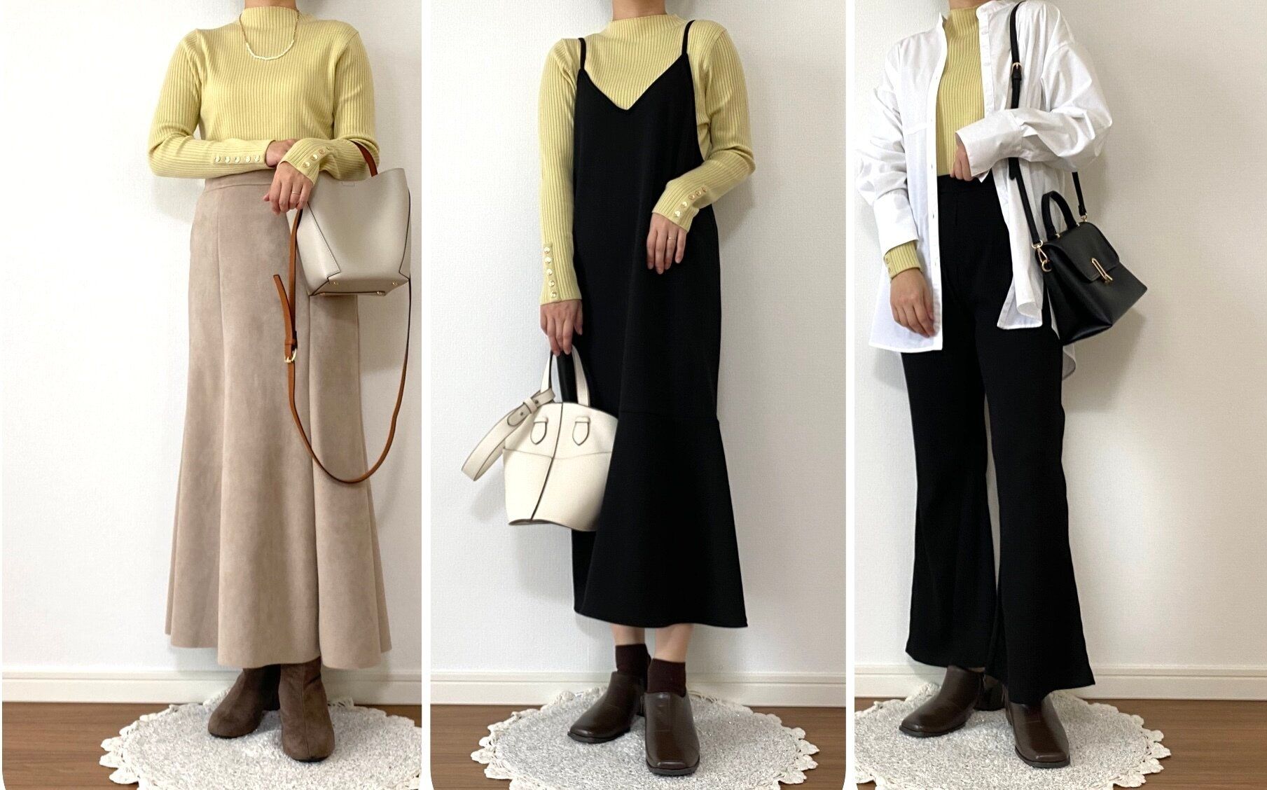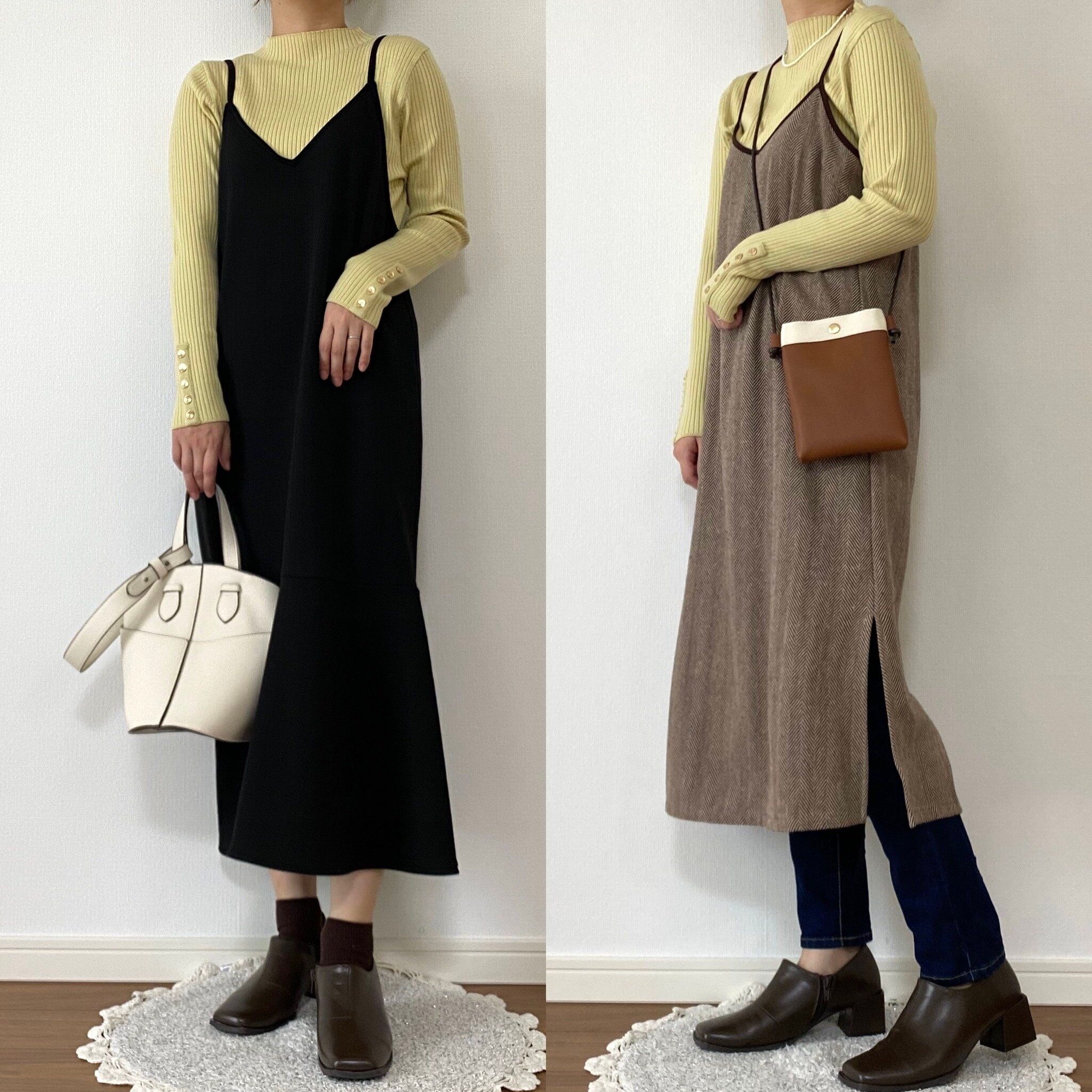 右は上からシャツを羽織ってインナー使い。薄手のニットなのでインナーに使ってもかさばらずレイヤードスタイルにも取り入れやすいです!