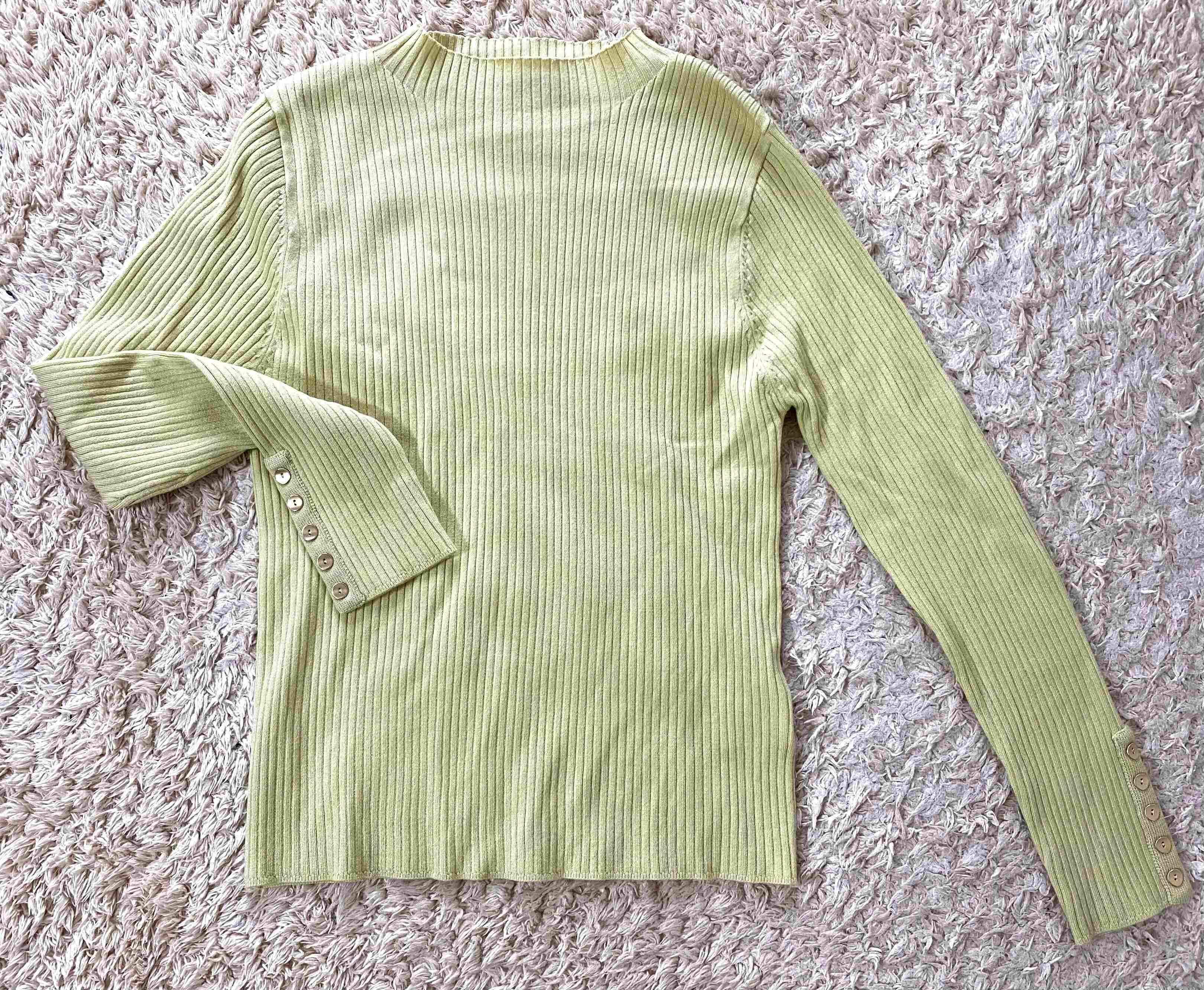 このニット最大のポイントは袖口に並んだゴールドボタン。シンプルで着回しの効くニットですがこのワンポイントで一枚で着ても様になります!