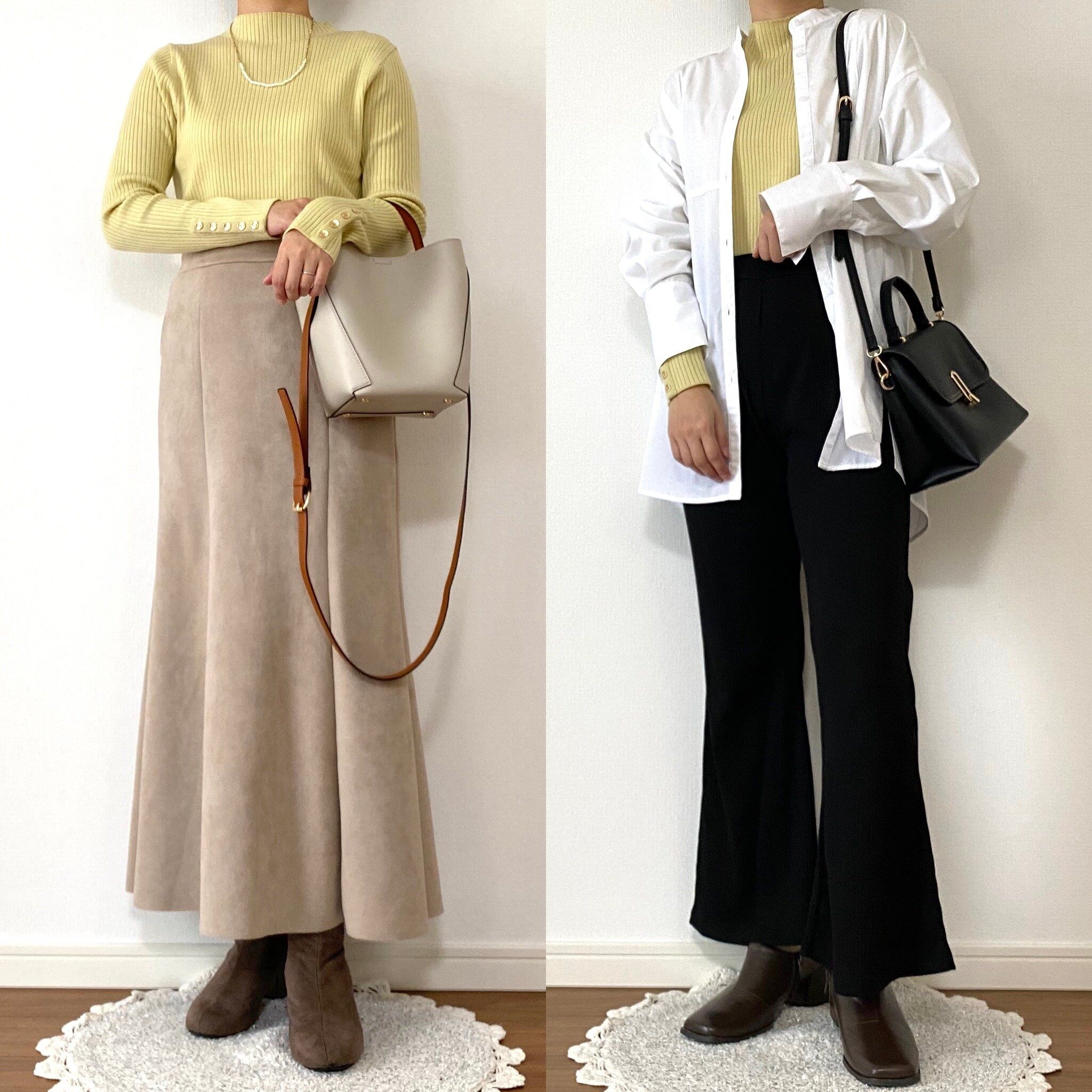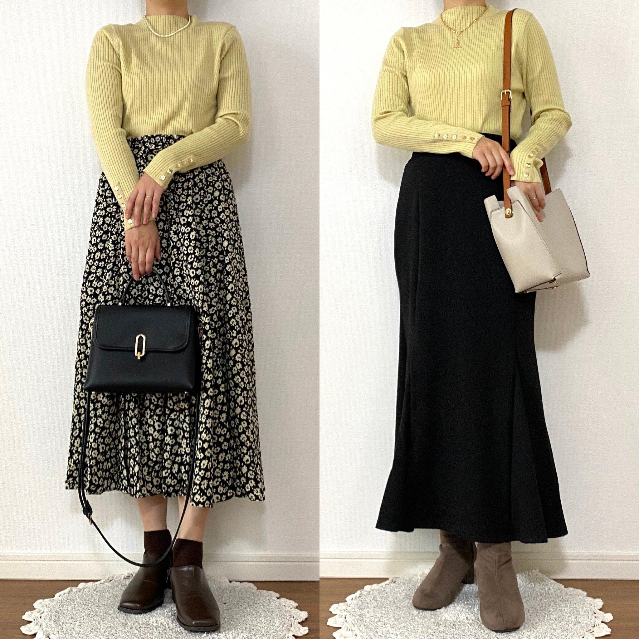 左はベージュのスカートと合わせて淡色コーデに加えてみました。