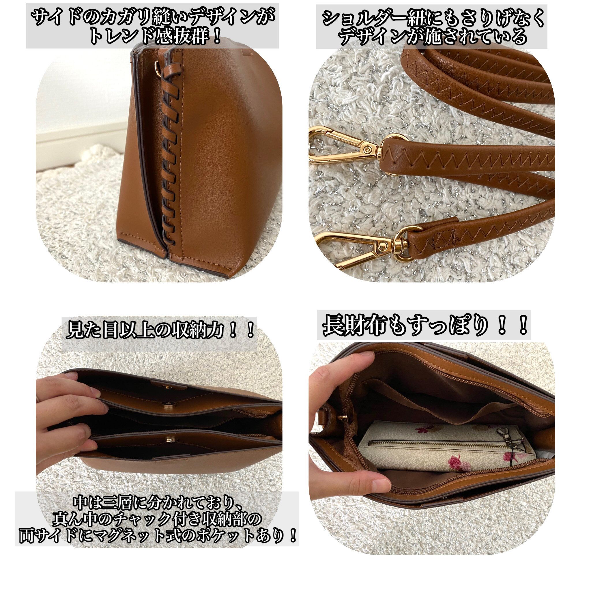 サイドのカガリ縫いデザインに加えて、ショルダー紐にもさりげなくギザギザの縫い目デザインが施されており、プチプラとは思えないデザイン性の高さです。