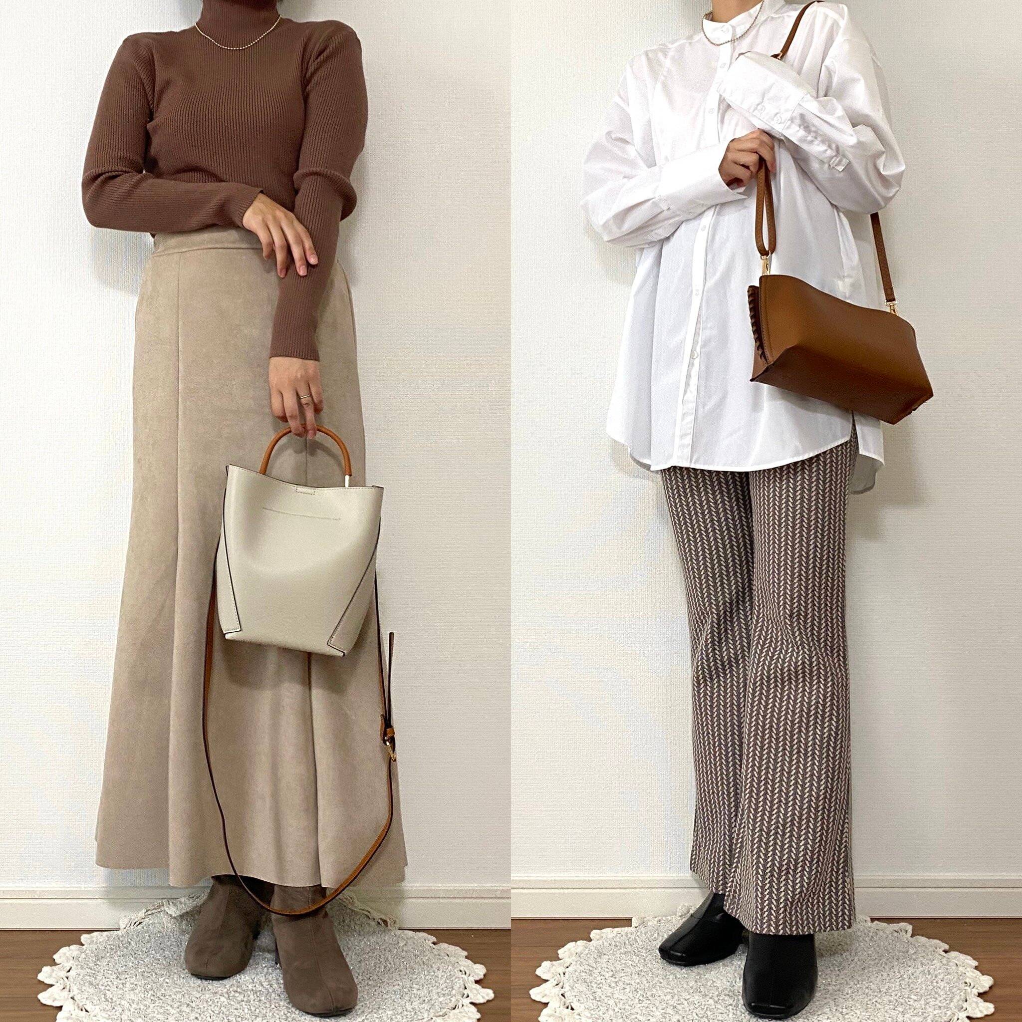 左はブラウンのニット、右はブラウンのヘリンボーン柄フレアパンツと合わせてみました。