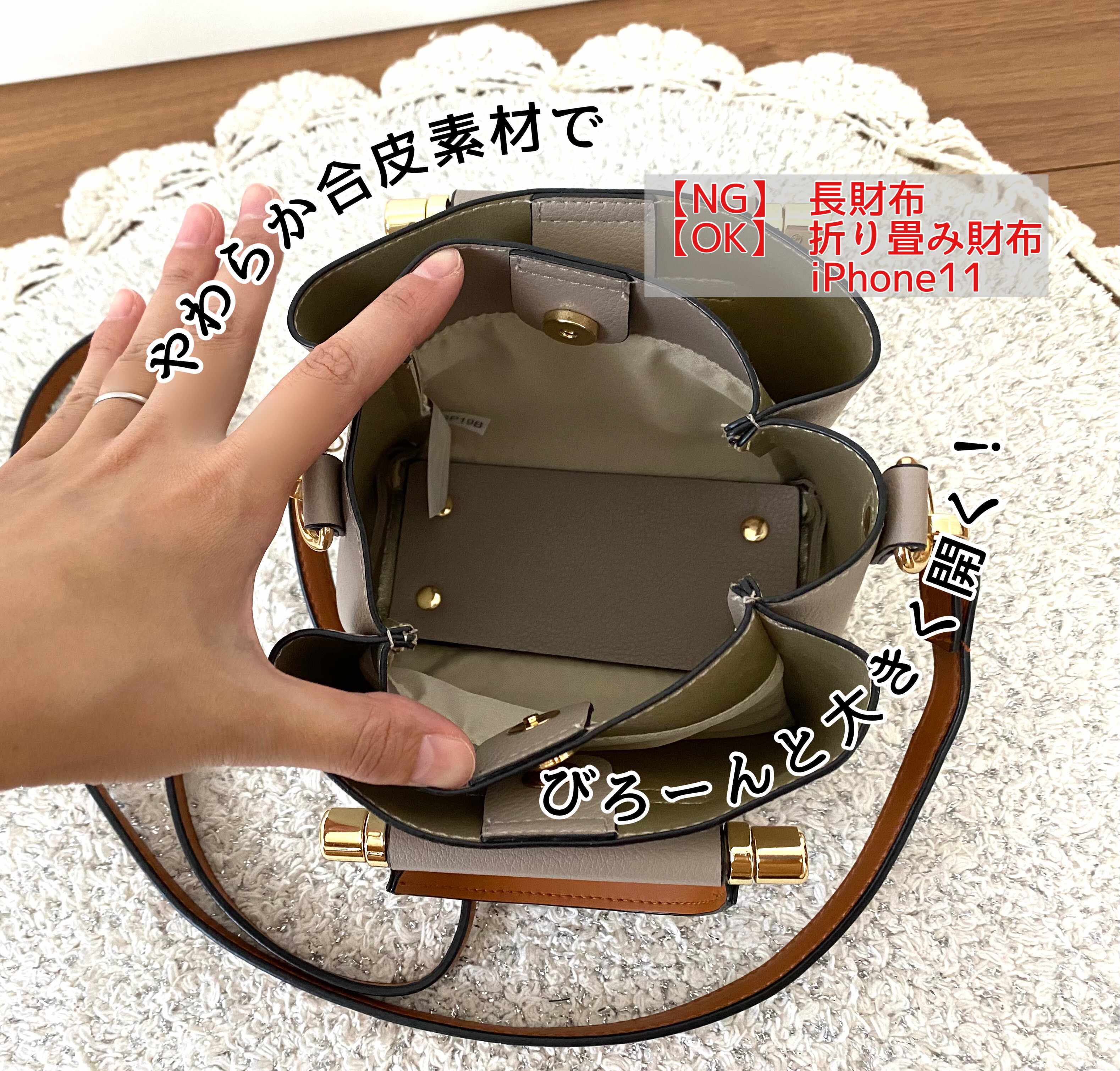 中身は3つに分かれおり1番大きい真ん中の収納には折りたたみ財布とiPhone11がすっぽりと入りました。見た目よりも収納力があります!