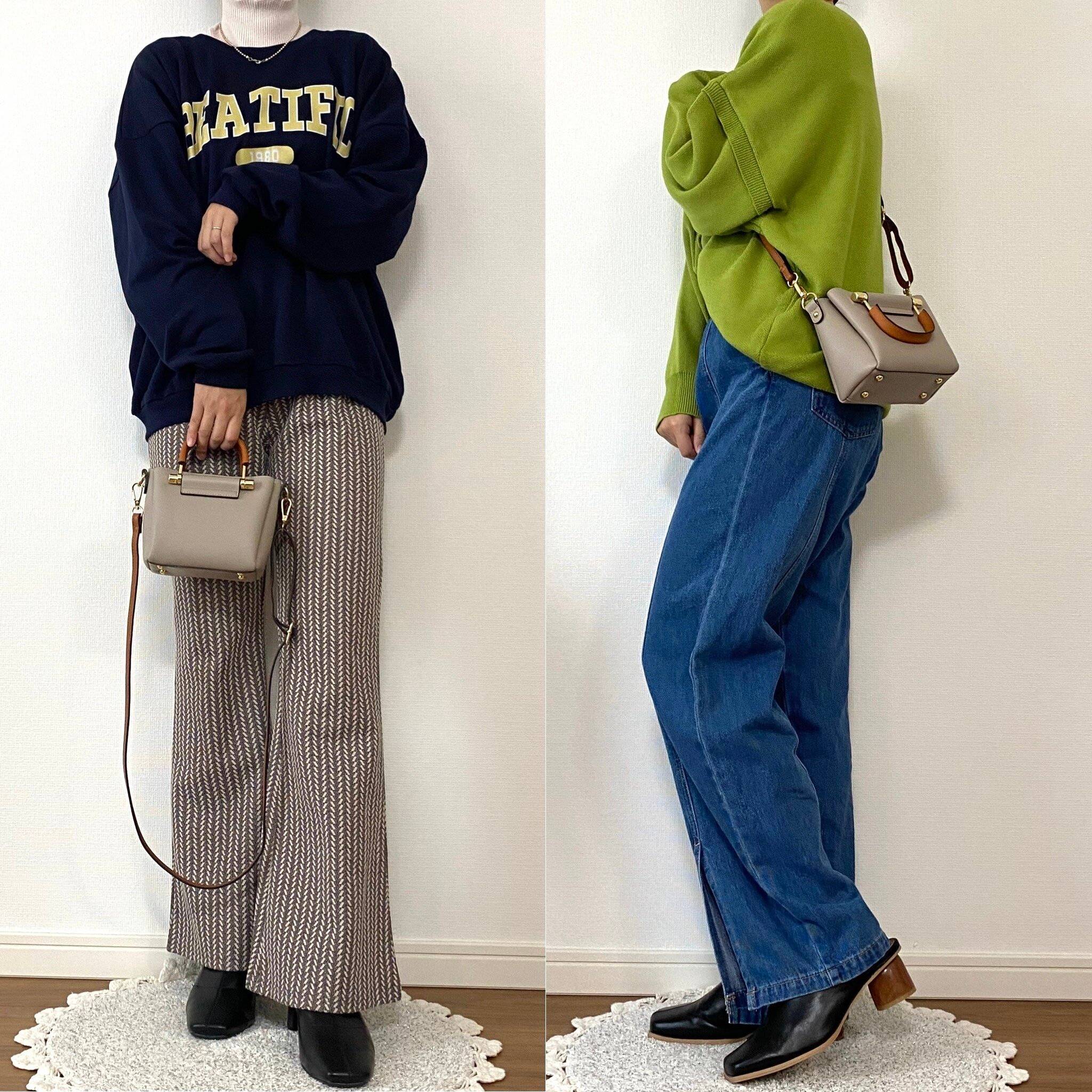 左はベージュのワントーン淡色コーデに合わせてみました!グレージュカラーが淡色コーデによく馴染んでくれます。
