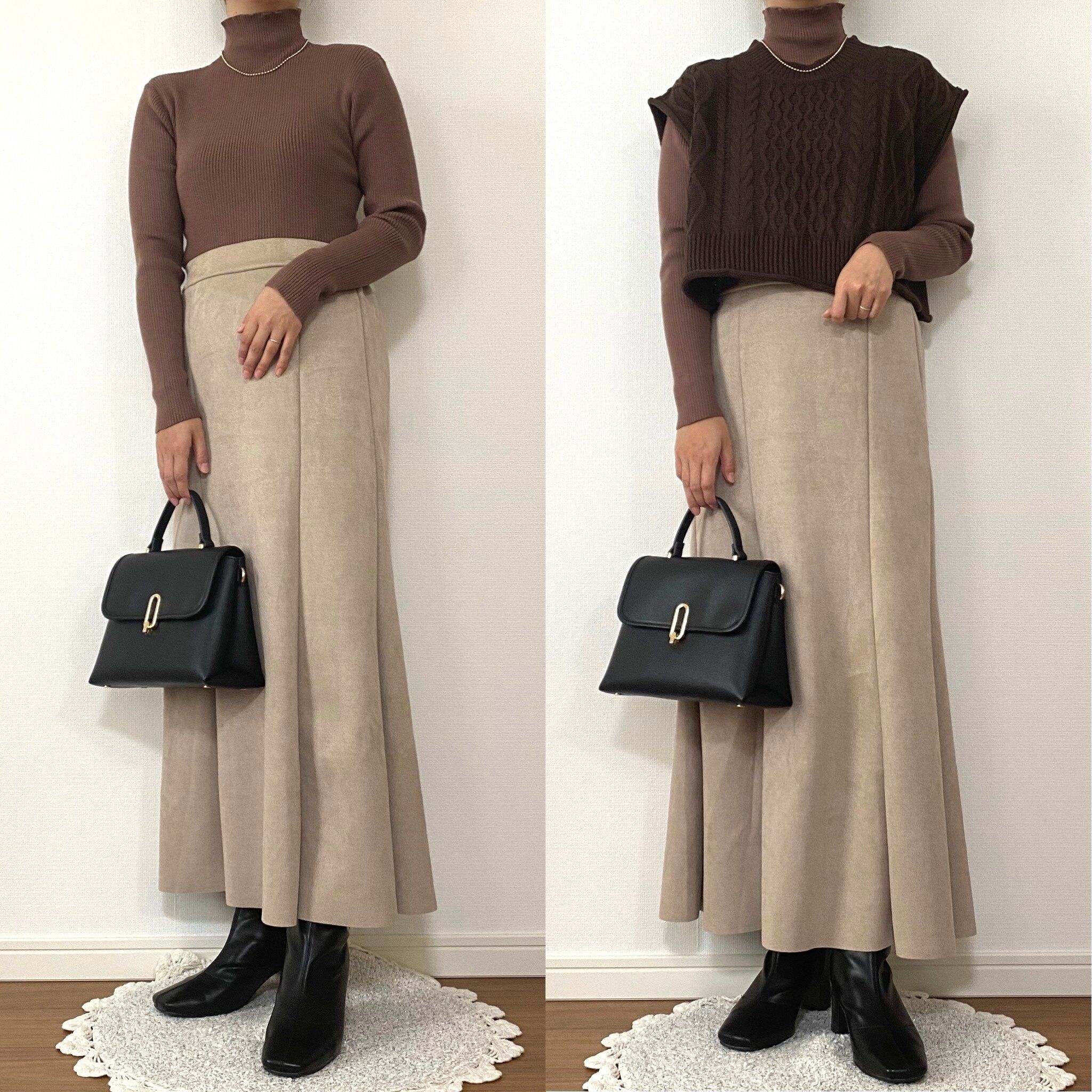 左は淡色コーデを意識してみました。全体をベージュのトーンでまとめてバッグとブーツのブラウンを差し色でポイントに。