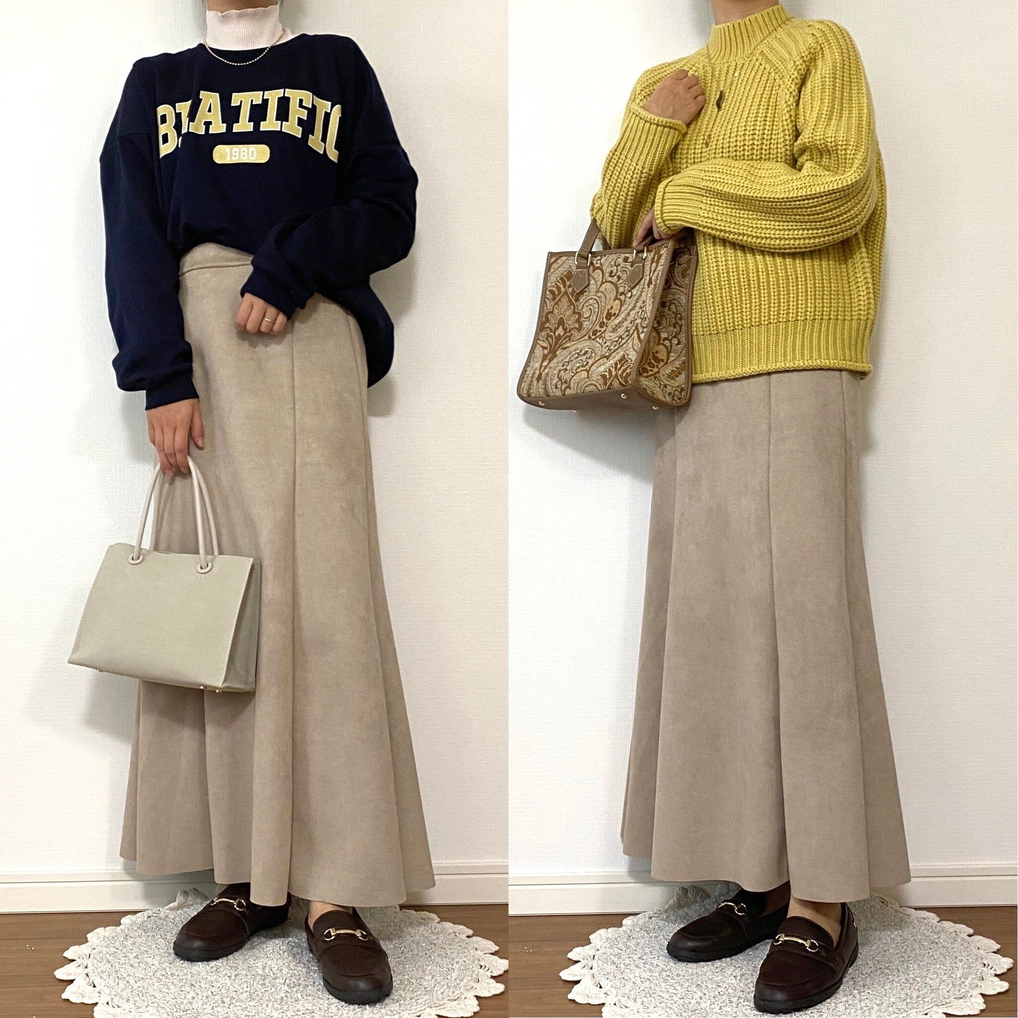 左のように綺麗めアイテムのマーメイドスカートを、スウェットでカジュアルダウンさせるのも今のトレンドコーディネートですよね!