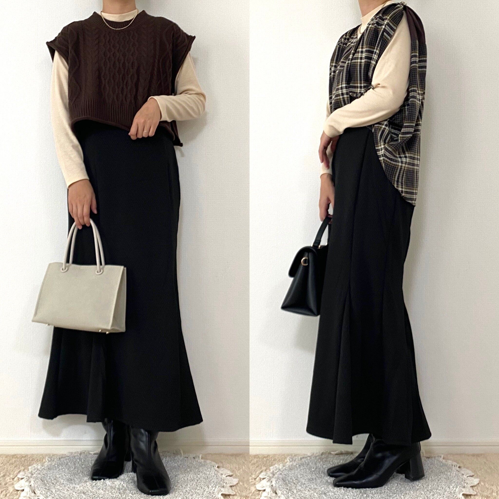 ブラックなら他のアイテムとも合わせやすいですし、私のような腰張り体型に不安がある方にも挑戦しやすいと思います!不安があれば今回のようにロング丈のトップスで腰回りを隠してしまうのも手ですよね。