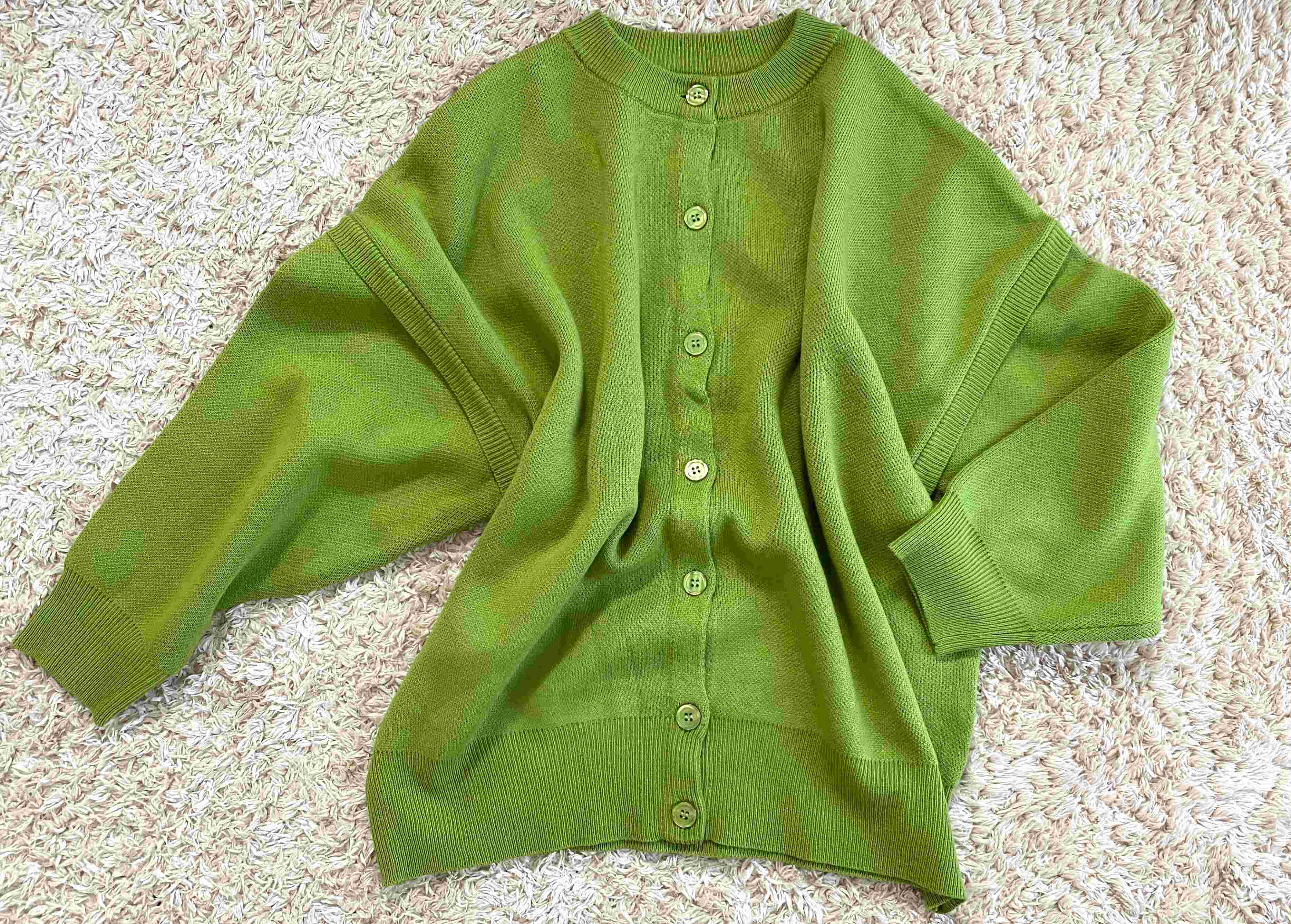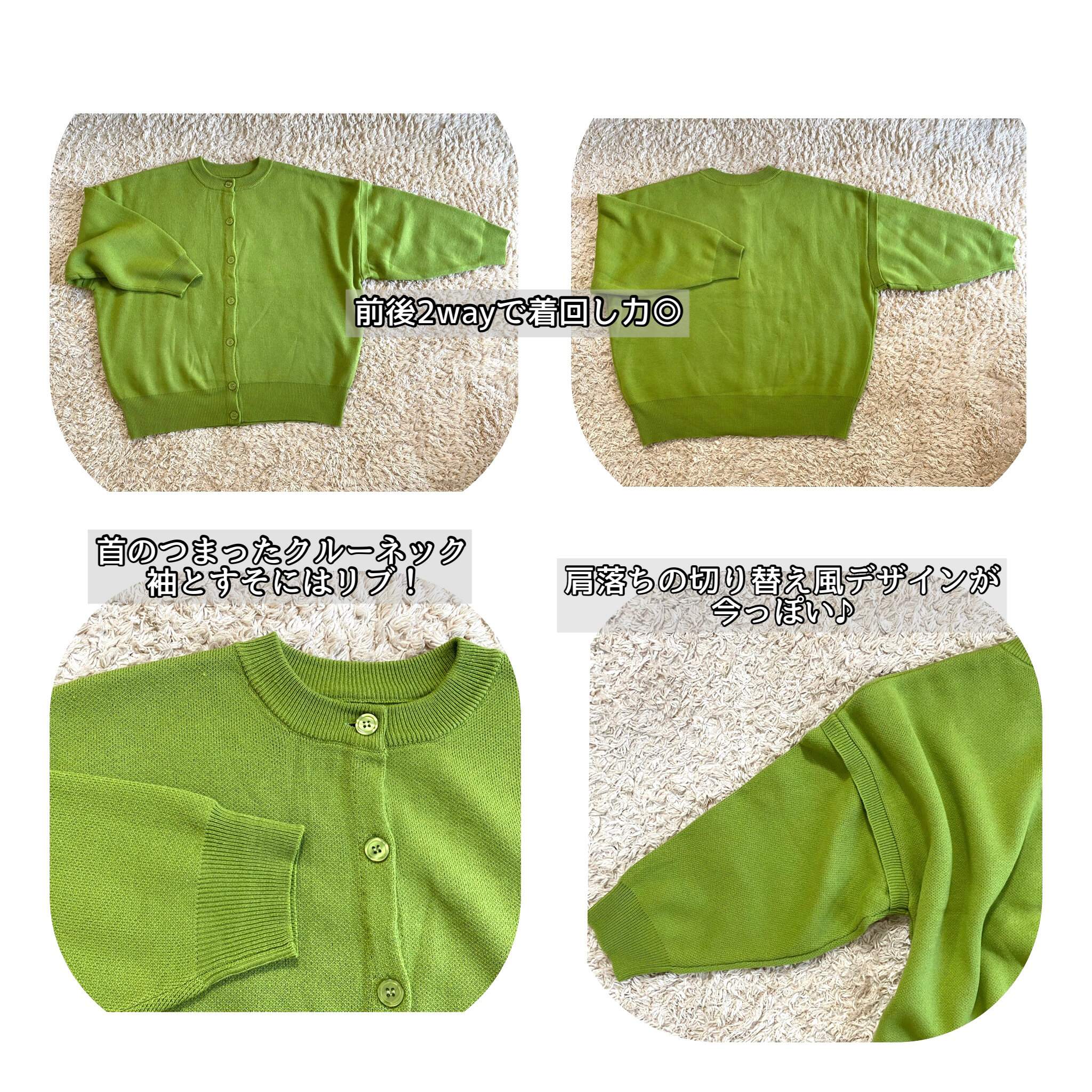今回はチラシを見た時にパッと目に入ってきたほど存在感のある商品の「イエローグリーンが映える2wayカーディガン」をご紹介します!