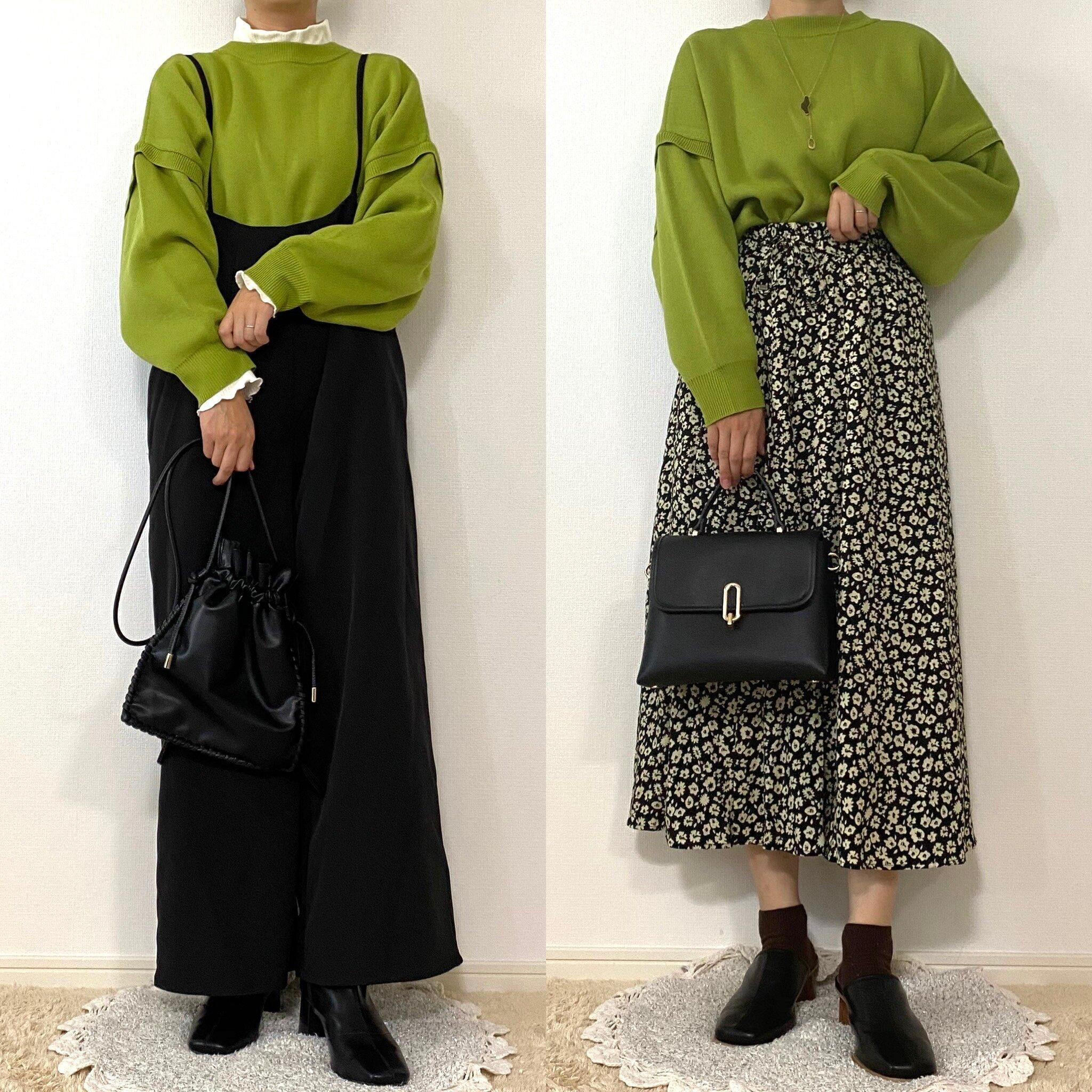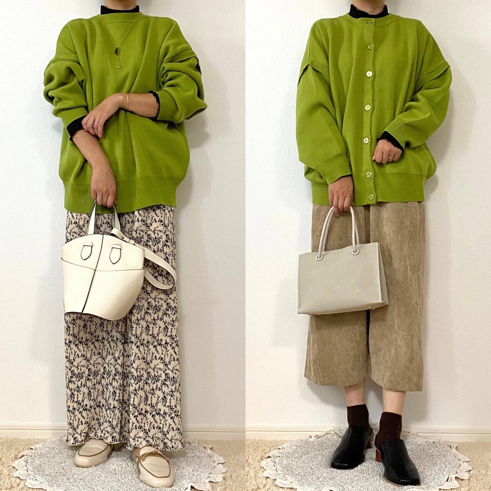 とにかくこのイエローグリーンのお色がとっても可愛いらしく、秋冬のグリーンだとダーク系のグリーンが多い印象ですがこちらは着るだけで顔まわりがパッと華やかになるような明るいお色で新鮮でした!