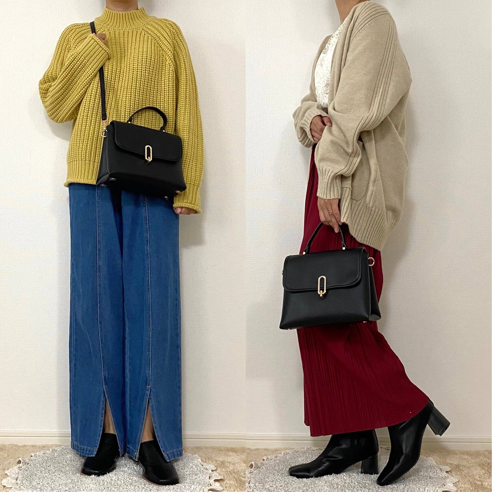 左はゆったりイエローニットにワイドめなデニムで全体的にゆるっとしたコーデですが、黒バッグを斜め掛けするとコーデに締まりが出てスタイルアップ効果も!