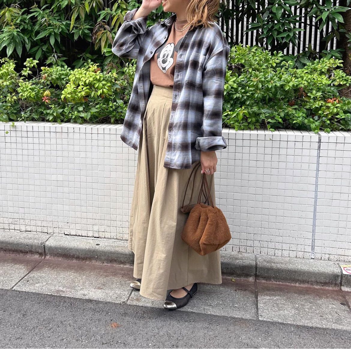 おしゃれ上級者な印象を与えたい人は、「フランネルシャツ」をビスチェ風に巻く着こなしもおすすめ。ポイントはシャツ以外のアイテムはカラーを統一&シンプルなデザインのアイテムをチョイスすること。そうすれば、一見難しそうなビスチェ風巻きもやりすぎ感なく、コーディネートに溶け込みます。新たな着こなしにチャレンジしてみたい人はトライしてみて♪