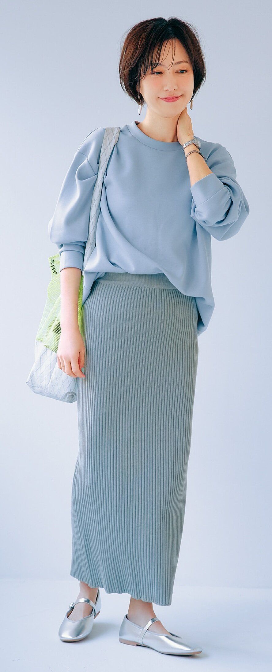 くるぶし丈が細見え効果絶大のリブスカート。このグレーは濃い色にも明るい色にもなじむから、着回し力が高い!