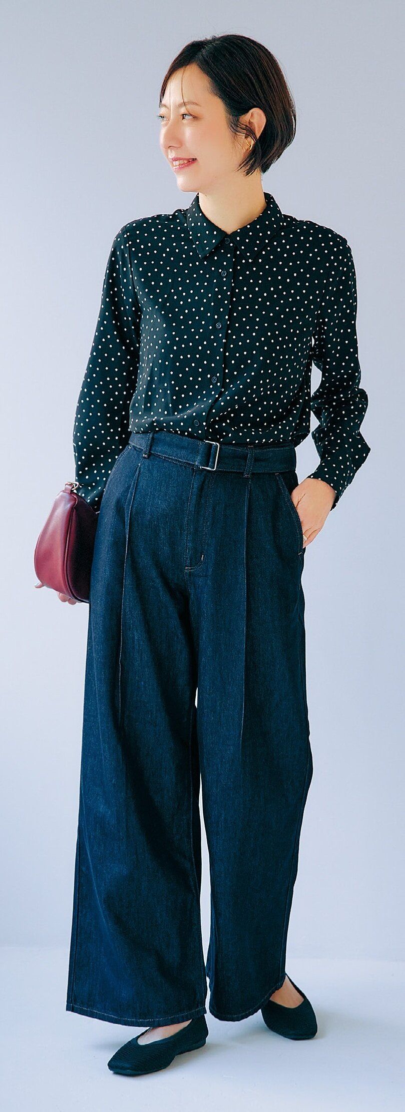 ベルト付きのワイドなデニムパンツがとても高見え。あえてとろみ素材のシャツでキレイめにまとめるのが気分です。