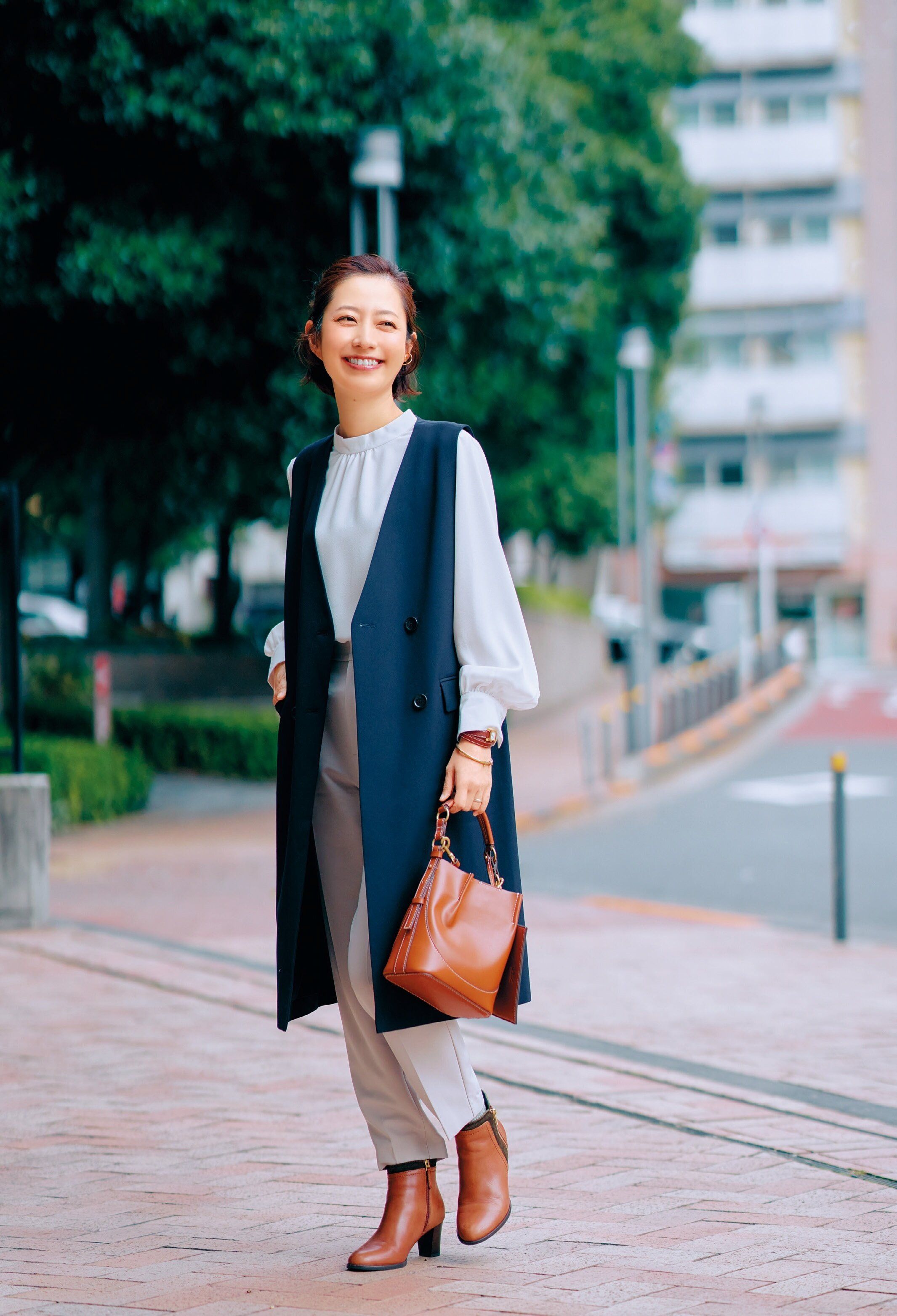 最近よくお客様から聞かれるのが「ジレが欲しいけど、どこで買えばいい?」という質問。今季は断然こちらを推します。長さがひざまであってボディーラインがすっきり見えるし、パッと羽織るだけでおしゃれがランクアップします。