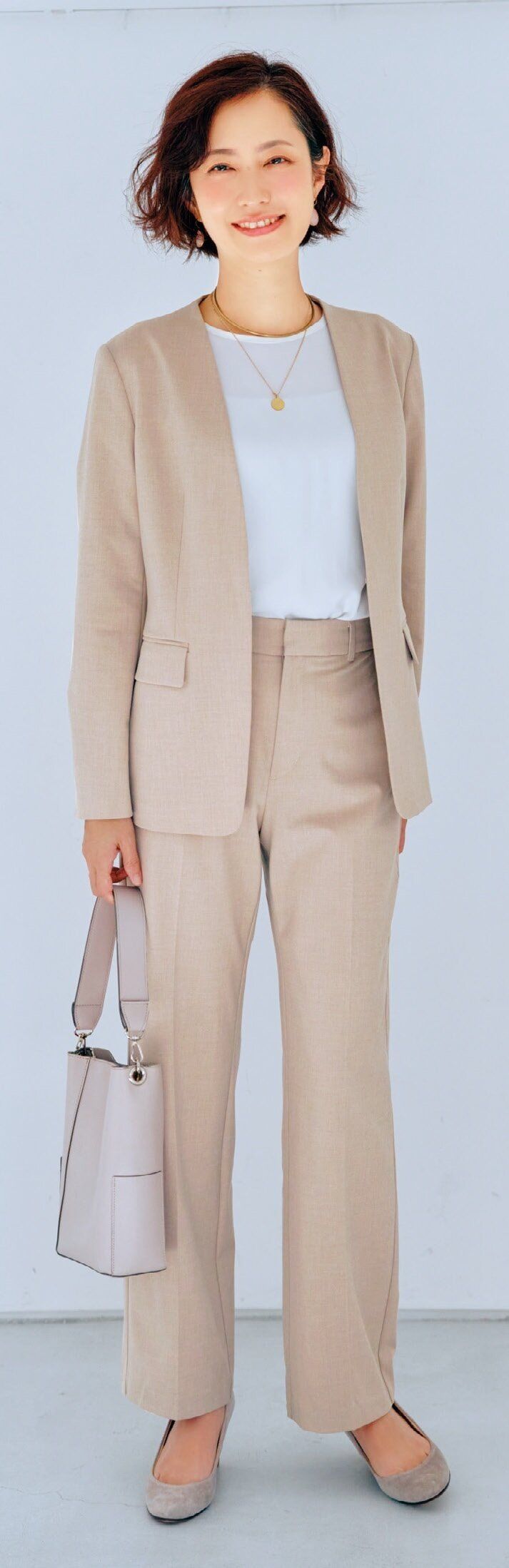 きちんとした服を買い足したいなら、ベージュのセットアップに外れなし。軽やかな印象で春のオケージョンにも便利。