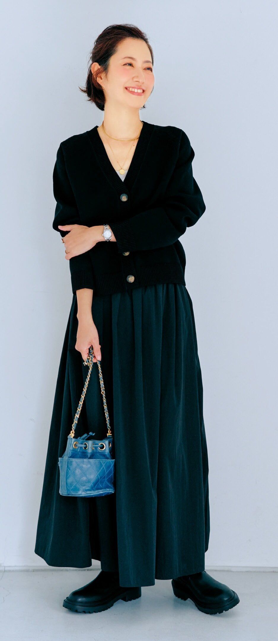 コンパクトなカーデにはボリュームスカートでバランス良く