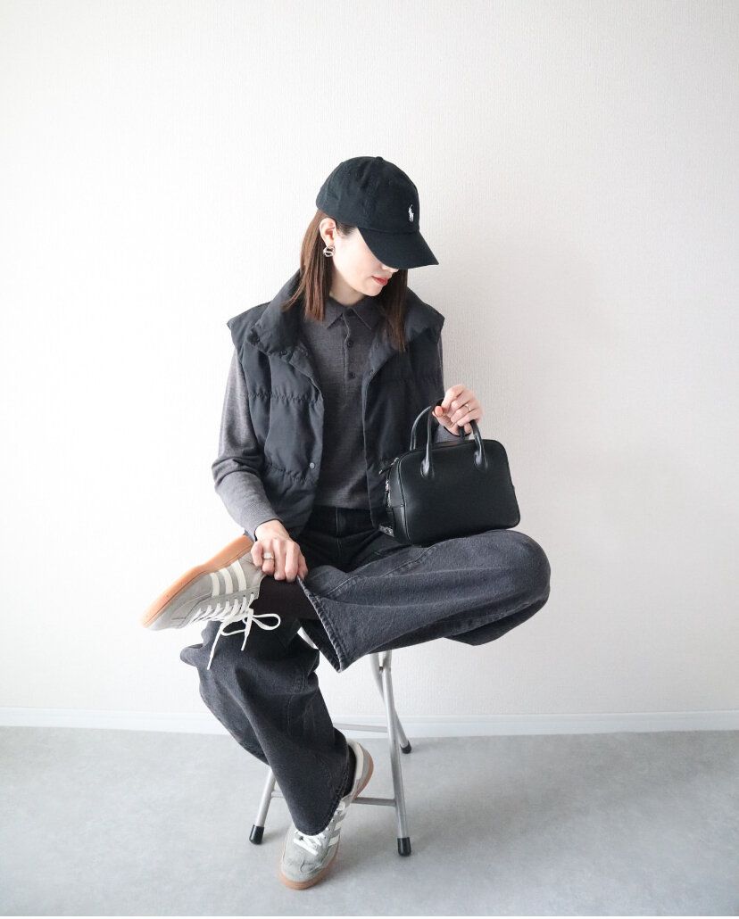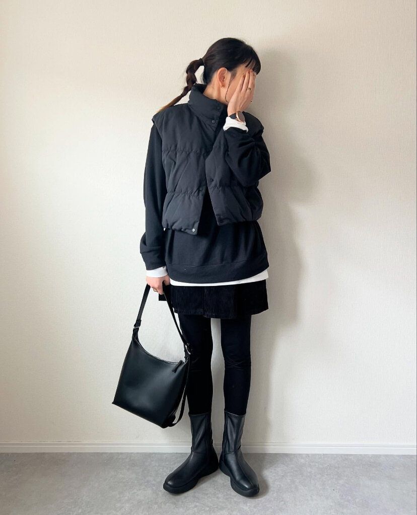 ほぼブラックのコーディネートは、裾と袖にちらっとホワイトが見えるだけでおしゃれさん度が大幅UP!また、ブラックのユニクロヒートテックレギンス(1,290円)を取り入れれば、ミニ丈のボトムスにもチャレンジしやすい♪モノトーンコーディネートは肌の露出を抑えつつもファッションを楽しめるのでアラフォーにピッタリです。