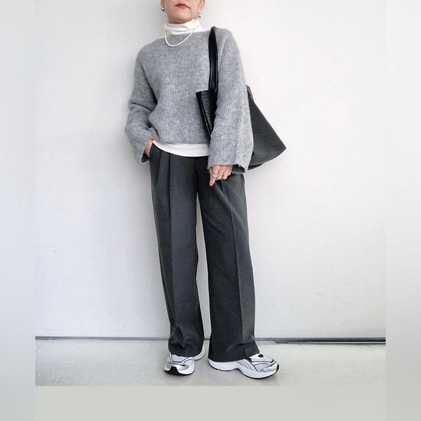 ワンカラーのグラデーションコーディネートもモノトーンならチャレンジしやすい!淡いグレーと濃いグレーを組みあわせたワントーンコーディネートは、だれでも取り入れやすいベーシックなカラー&アイテムなのに、ワンランク上のおしゃれな印象を与えてくれます。GU「タックワイドパンツ」(2,990円)はカジュアルにもきれいめにも着まわせる万能パンツなのでおすすめ。