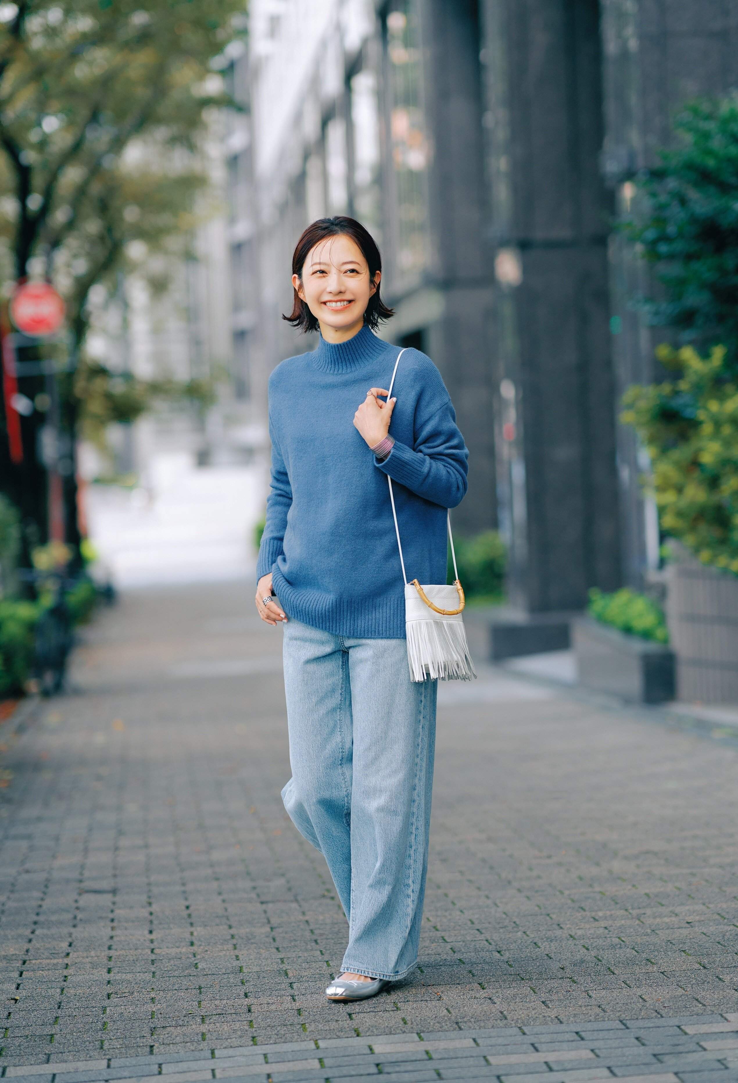 寒い季節のコーディネートにこそ、積極的に取り入れたいのがキレイ色のアイテム。40代におすすめなのがブルーのニットです。黒やベージュのボトムとも合うけれど、ブルーデニムと合わせて全身ワントーンでまとめるとグッとあか抜けます。