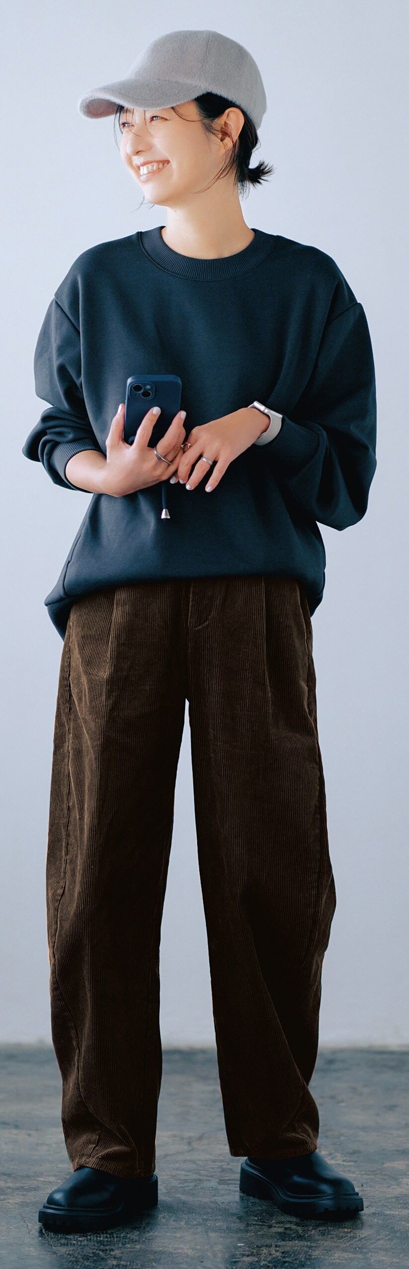 バレルレッグパンツにコーデュロイが登場。ザ・カジュアルなアイテムだけど、ダークブラウンなら大人も使いやすい。