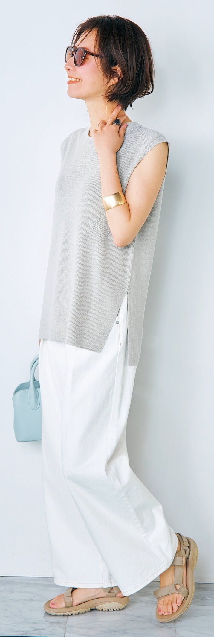 グレー、ベージュ、ライトブルーという上品さを感じる中間色をホワイトデニムに合わせて、品のいい大人カジュアルに。
