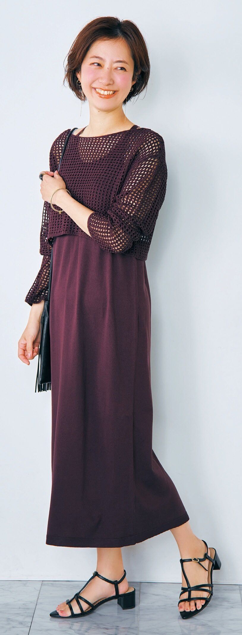 メッシュトップスが気になる二の腕をカバーしてくれるので、キャミワンピを品良く着こなせます。