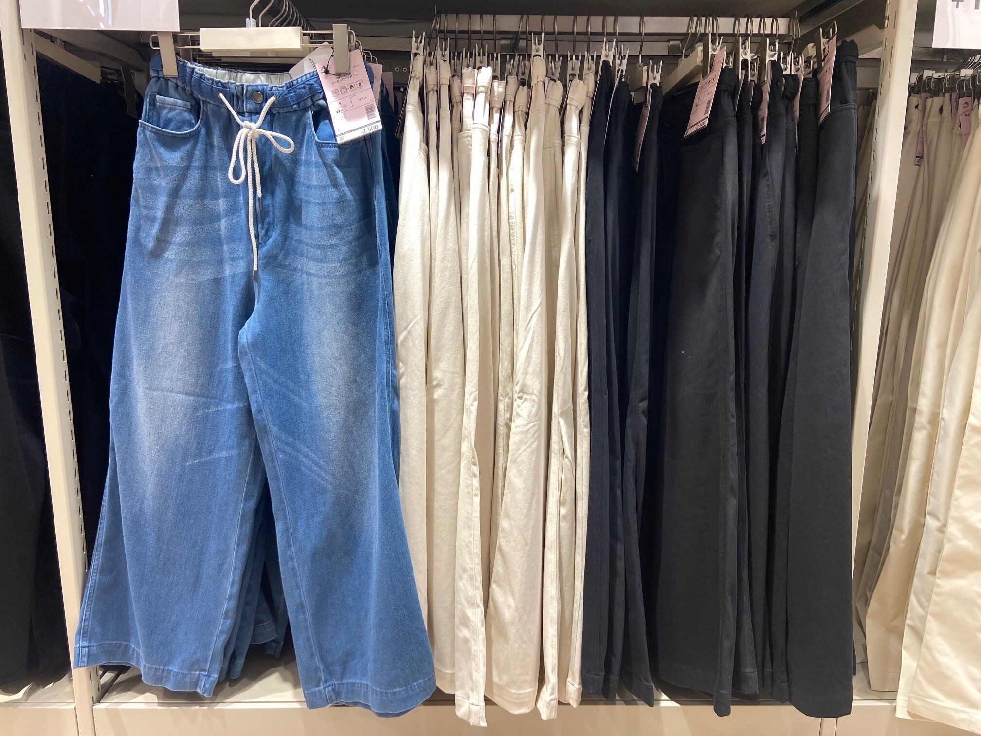 「WEMOTION イージーワイドパンツ」(2,500円)は、今季のファッションに欠かせないトレンドのワイドデニム風パンツ。デニムのようなルックスですが、2WAYストレッチ仕様なので動きやすいのが特徴的。ウエストもゴムなので、おでかけはもちろん、おうちでリラックスして過ごすときにもおすすめです。