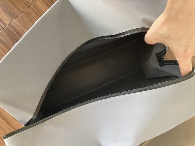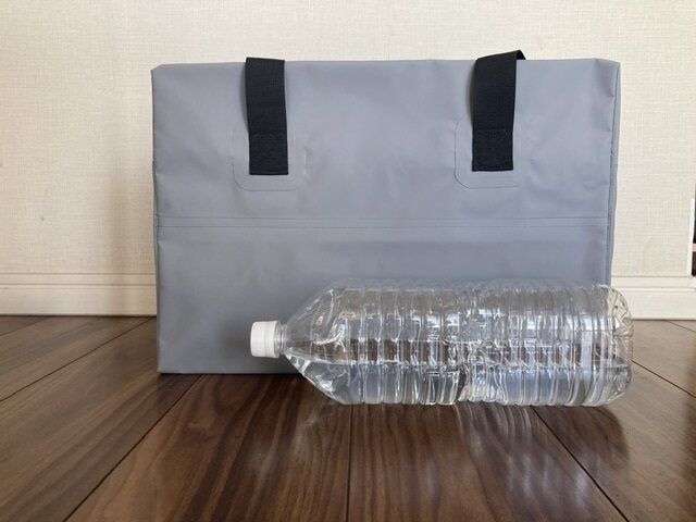 防水バッグだから、雨や悪天候時の持ち運びも安心。ファスナーは止水ファスナーで、綴じ目から水をかけても中にしみこみにくくなっています。