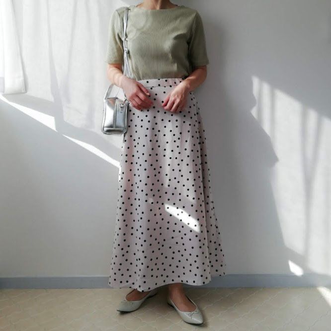 トップスをインしてウエストマークし、足もとに向かって広がるロングスカートで「Xライン」をつくったコーデ。